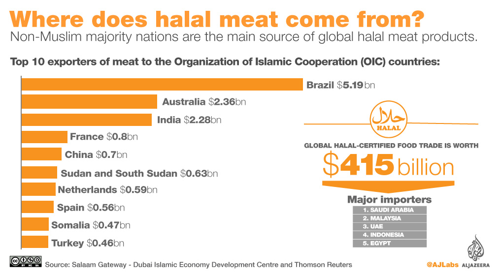 Brazil’s Muslims make up a tiny part of its population of 207 million people, at just over 200,000, yet the country is a leading exporter of halal beef, with the industry valued at close to $6bn in 2015.