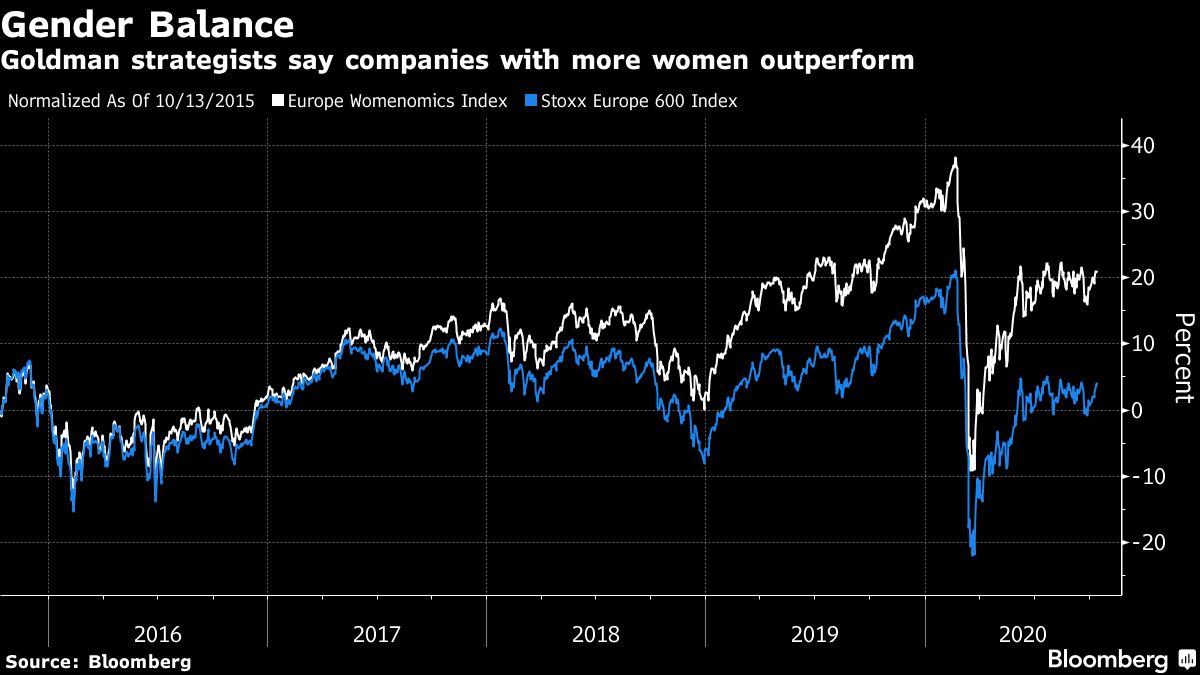 Goldman’s Europe Womenomics index is down about 7.8% this year, compared with a drop of 11% for the benchmark Stoxx Europe 600 gauge. Over the past five years, the difference is much more significant, with Womenomics up 22% compared with a gain of around 4.2% for the Stoxx 600.