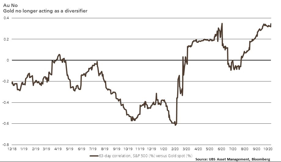 The rolling 63-day correlation between gold and the S&P 500 Index has been positive for the overwhelming majority of 2020. This means gold may no longer be a reliable ballast to portfolios during risk-off periods spurred by concerns about threats to economic activity. We attribute this dynamic to the strong correlation between gold and real rates in concert with the current stance and outlook for monetary policy.