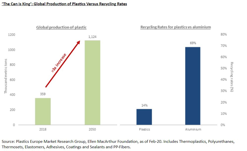 Based on current projections, the global production of plastics is set to more than triple by 2050, having already doubled over the past decade. By contrast, 75% of all the aluminum ever produced in the history of mankind is still in use today, with a global recycling rate for aluminum beverage cans standing at 69%. While much still remains to be done to ensure we arrive at a more environmentally sustainable-growth model – with advancements in biodegradable and more easily recycled plastics forming a key part of that transition – the reality is for now, “the can is king.”
