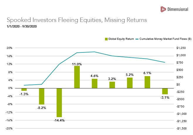 In March, spooked investors fled the stock and bond markets, with money-market inflows for the month totaling $684 billion. This was frightfully bad timing. Over the six-month period from April 1 to September 30, global equities and fixed income returned 29.54% and 3.16%, respectively. Scary to think about the impact that will have on the financial well-being of many savers.
