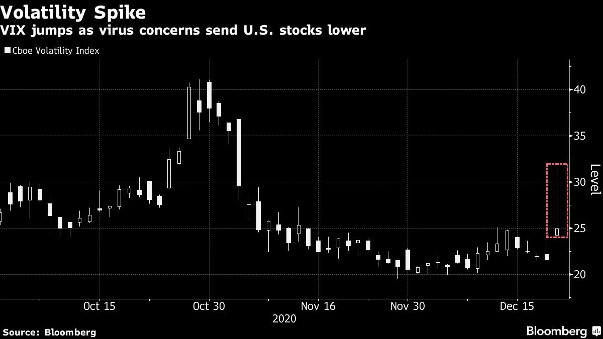 Volatility in US equities jumped in thin holiday trading. The Cboe Volatility Index, known as Wall Street’s “fear gauge,” notched its largest one-day gain since late October, even though it finished below its session high.