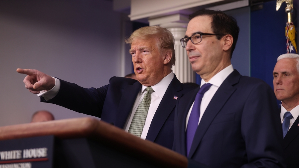 Appearing with Trump, US Treasury Secretary Steven Mnuchin said the Trump administration wants to send cheques to Americans within the next two weeks to help them cope with the virus fallout.