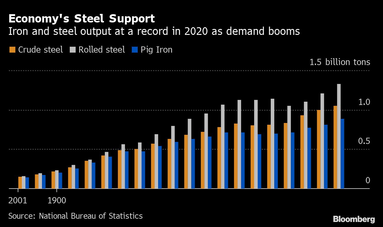 In contrast to consumption, China’s industrial economy hit new records in 2020. Crude steel output rose above 1 billion tons for the first time, and the production of rolled steel and aluminum also surged as investment in real-estate and infrastructure climbed.