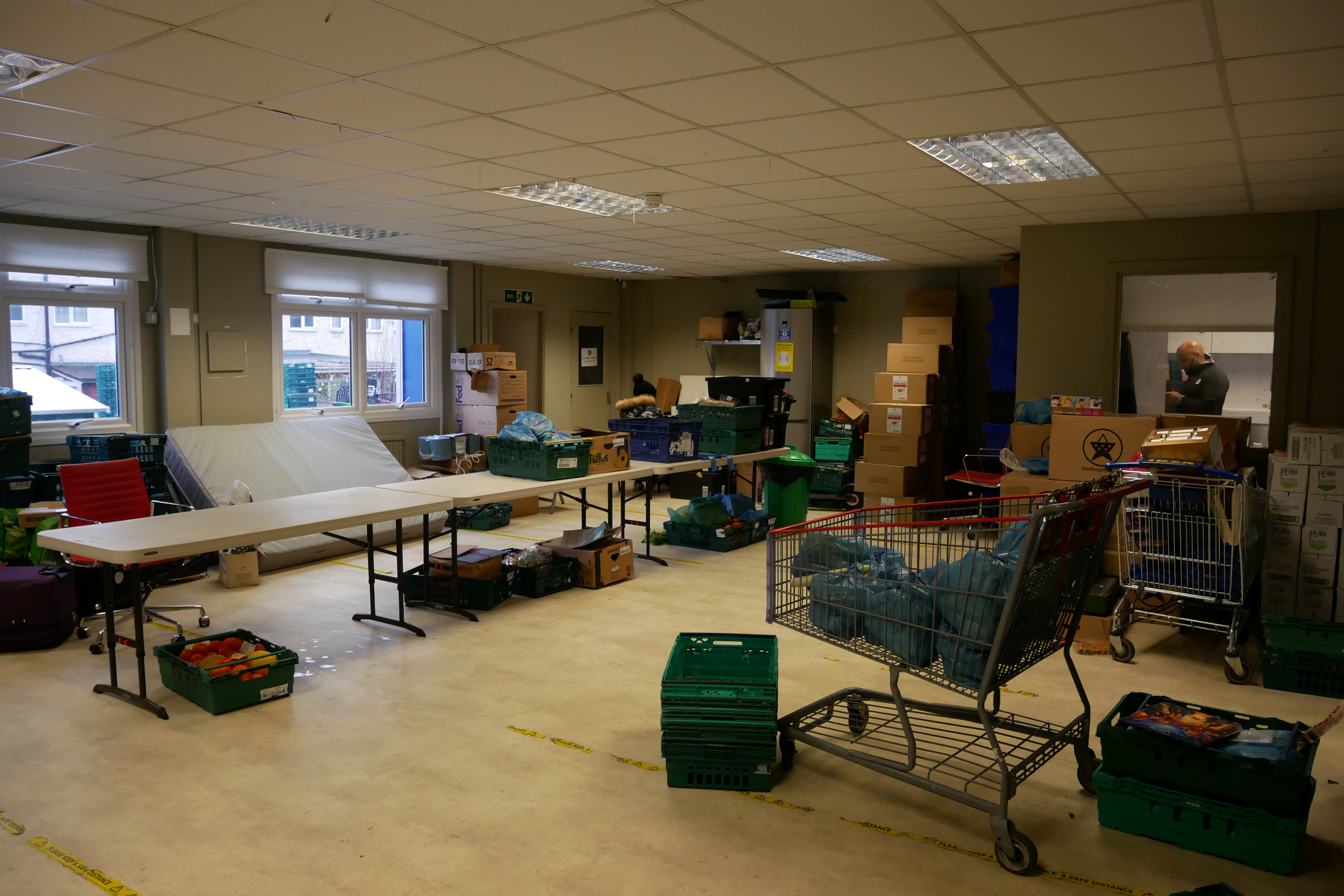 Today, the main space inside the food bank is empty barring a couple of volunteers sorting through boxes of donated vegetables from supermarket surplus.