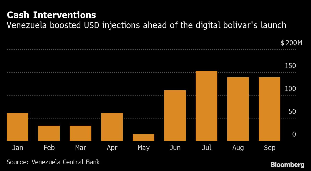 The central bank has injected around $40 million per week into the exchange market following the Oct. 1 introduction of the so-called digital bolivar. That’s about double the amount it normally sends to banks.