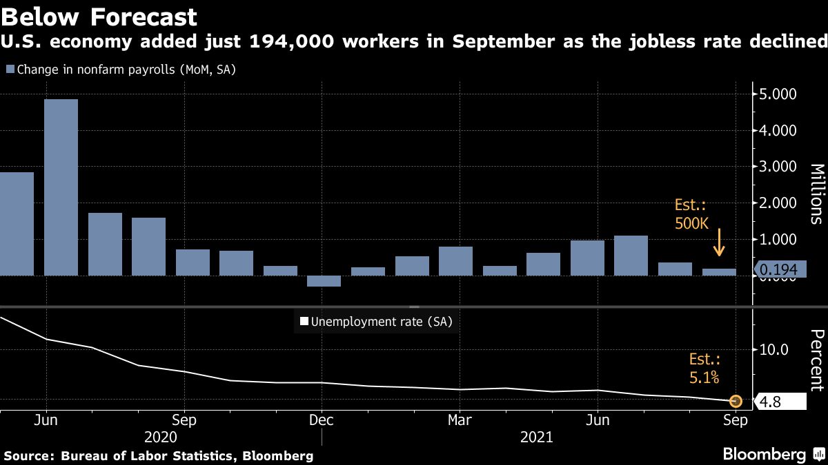 Nonfarm payrolls increased 194,000 last month after an upwardly revised 366,000 gain in August, a Labor Department report showed Friday. The unemployment rate fell to 4.8%, partly reflecting a decline in labor force participation among women. Meantime, average hourly earnings jumped.