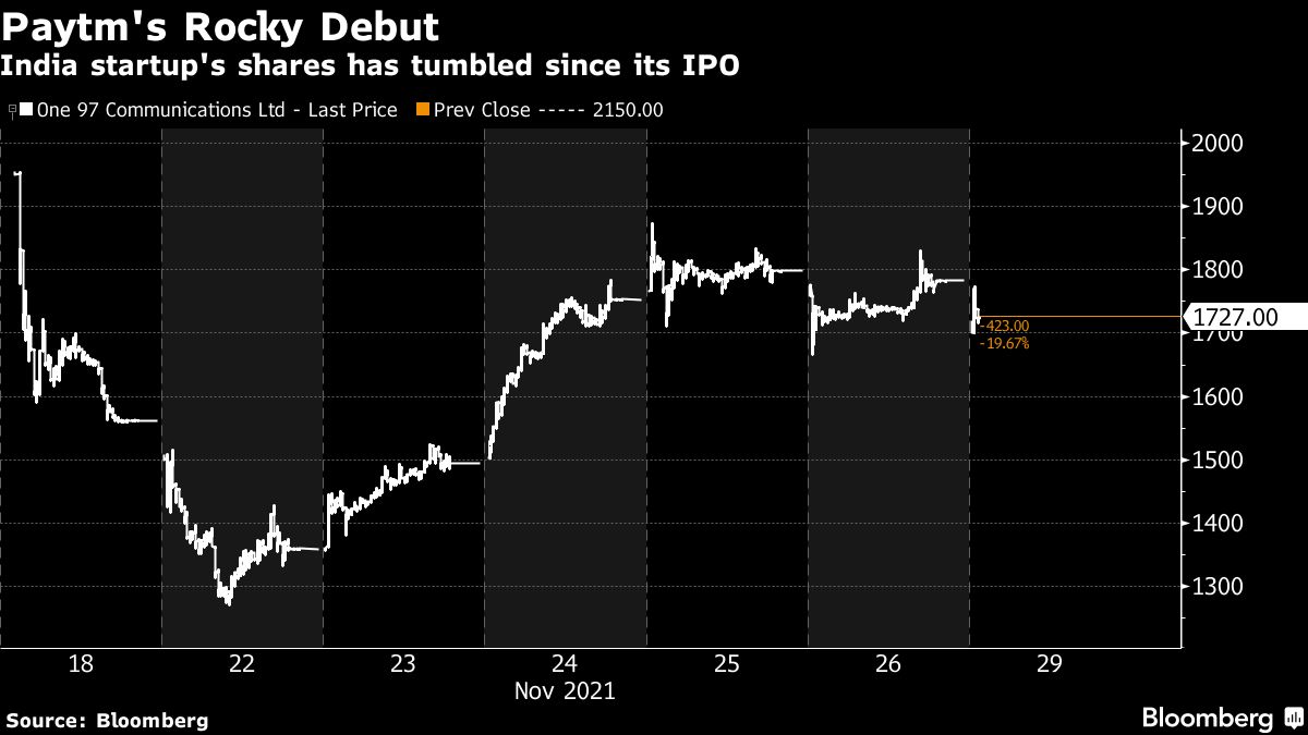 On Monday, the stock of One97 Communications, the parent of the digital payments giant, slid again, down as much as 4.6% to 1,700 rupees. That comes after shares ended last week 17% below the company’s IPO price of 2,150 rupees.