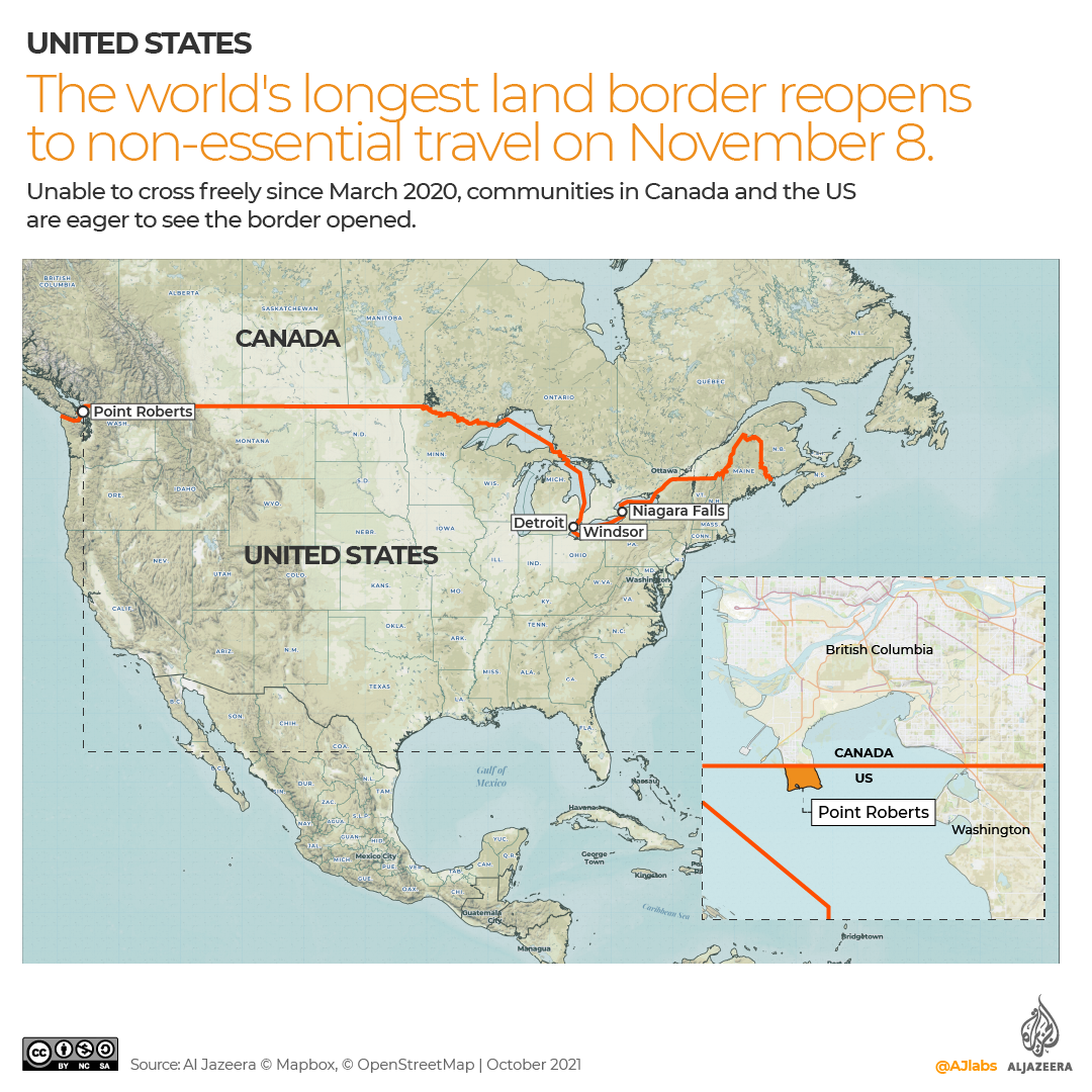 Canada has allowed fully vaccinated Americans to cross the land border since August 9; the US is opening its land border to fully vaccinated Canadians on November 8.