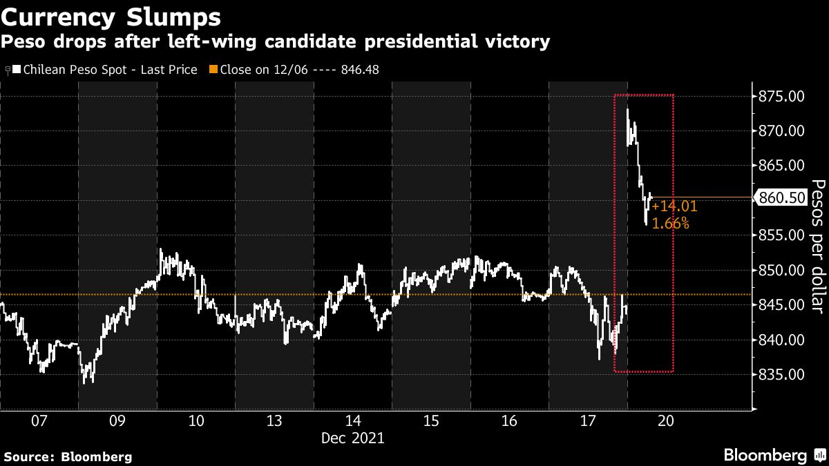 Chilean assets tumbled after left-wing candidate Gabriel Boric rolled to a blowout victory in Sunday’s presidential election, giving him a broad mandate to push ahead with an overhaul of Latin America’s most open economy.