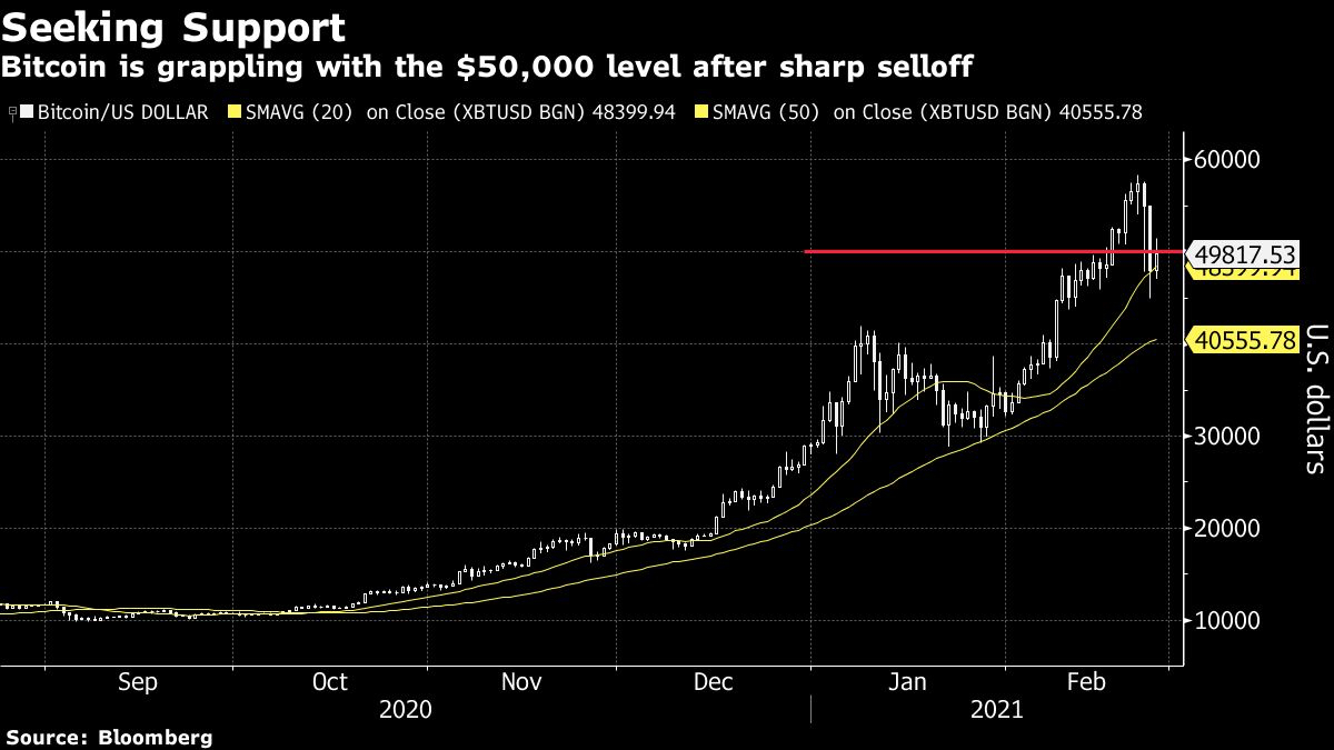 The digital token rose as much as 7% Wednesday, finding support near the $50,000 level. It traded around $49,860 as of 12:51 p.m. in New York. Prices plummeted about 13% on Tuesday in the worst retreat in a year.
