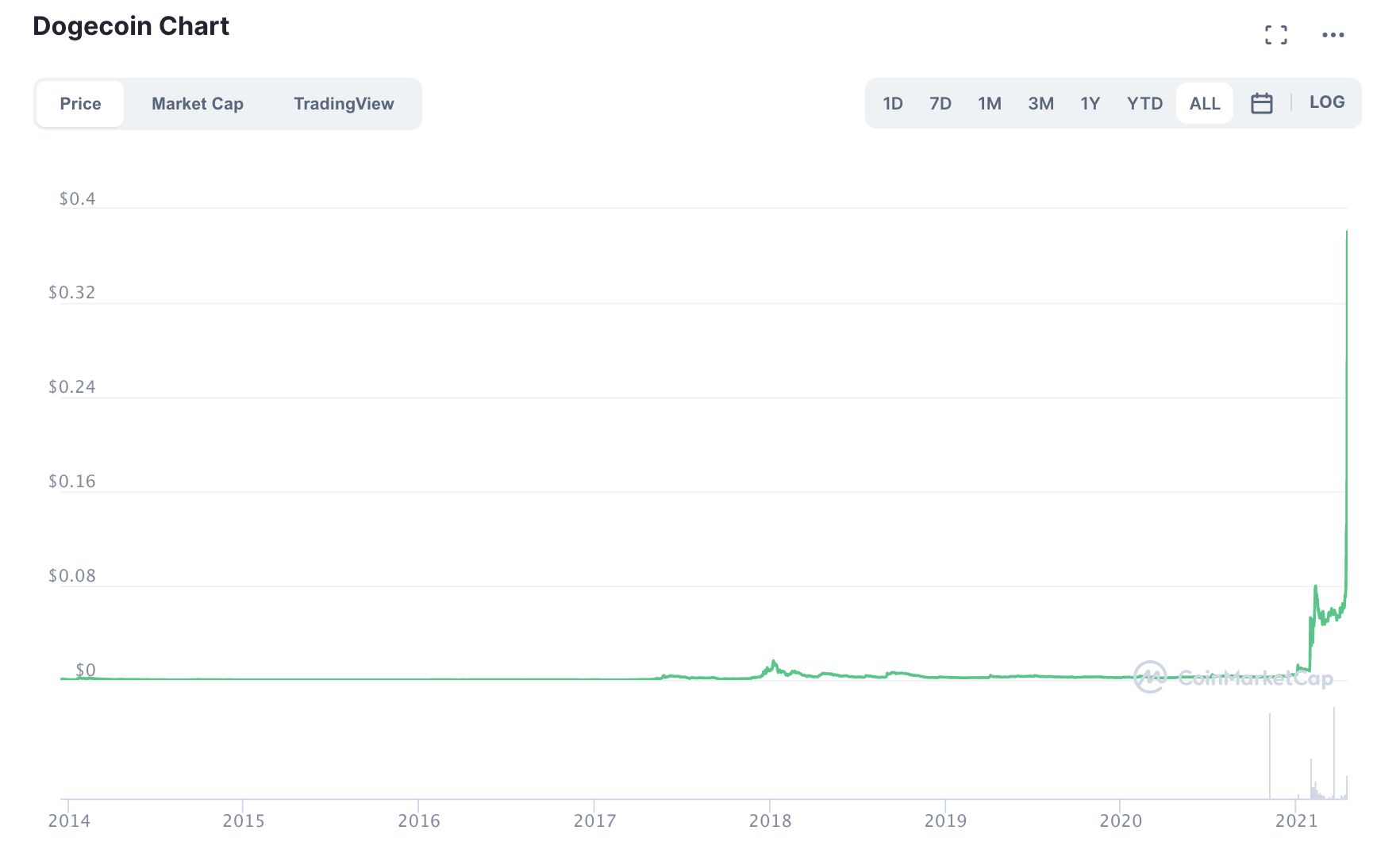 Dogecoin is now up 18,000 percent from a year ago, when it traded for $0.002 and was worth about $250 million.