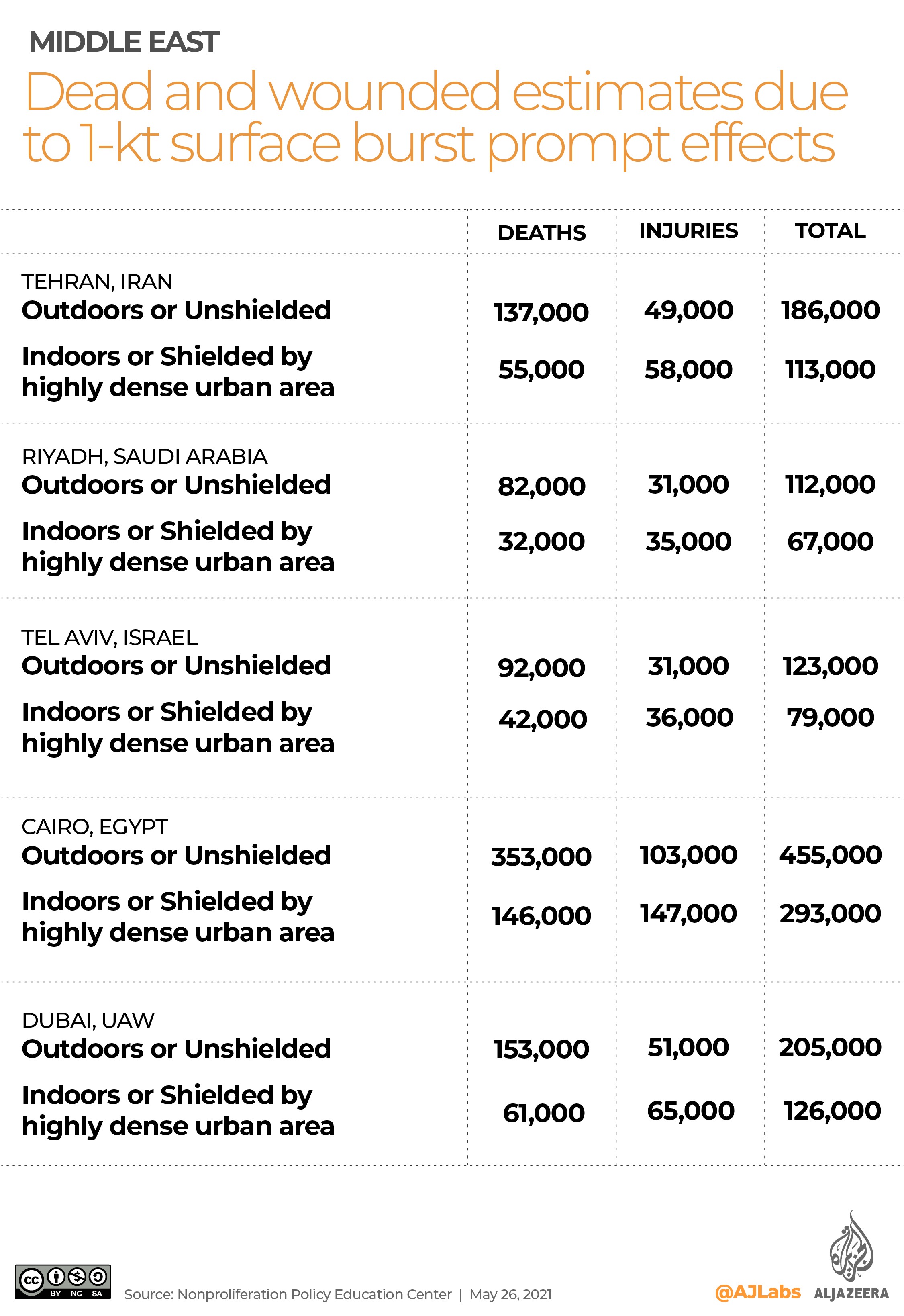 Outdoor “unshielded” estimates range from 82,000 dead and 31,000 wounded in Riyadh to 353,000 dead and 103,000 wounded in Cairo. Indoor “shielded” death tolls range from 32,000 to 146,000 in each city, respectively.
