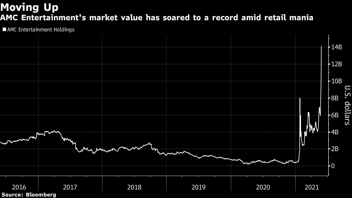 AMC Entertainment Holdings Inc.’s eager retail investors have vaulted the company’s market value to $14 billion for the first time.