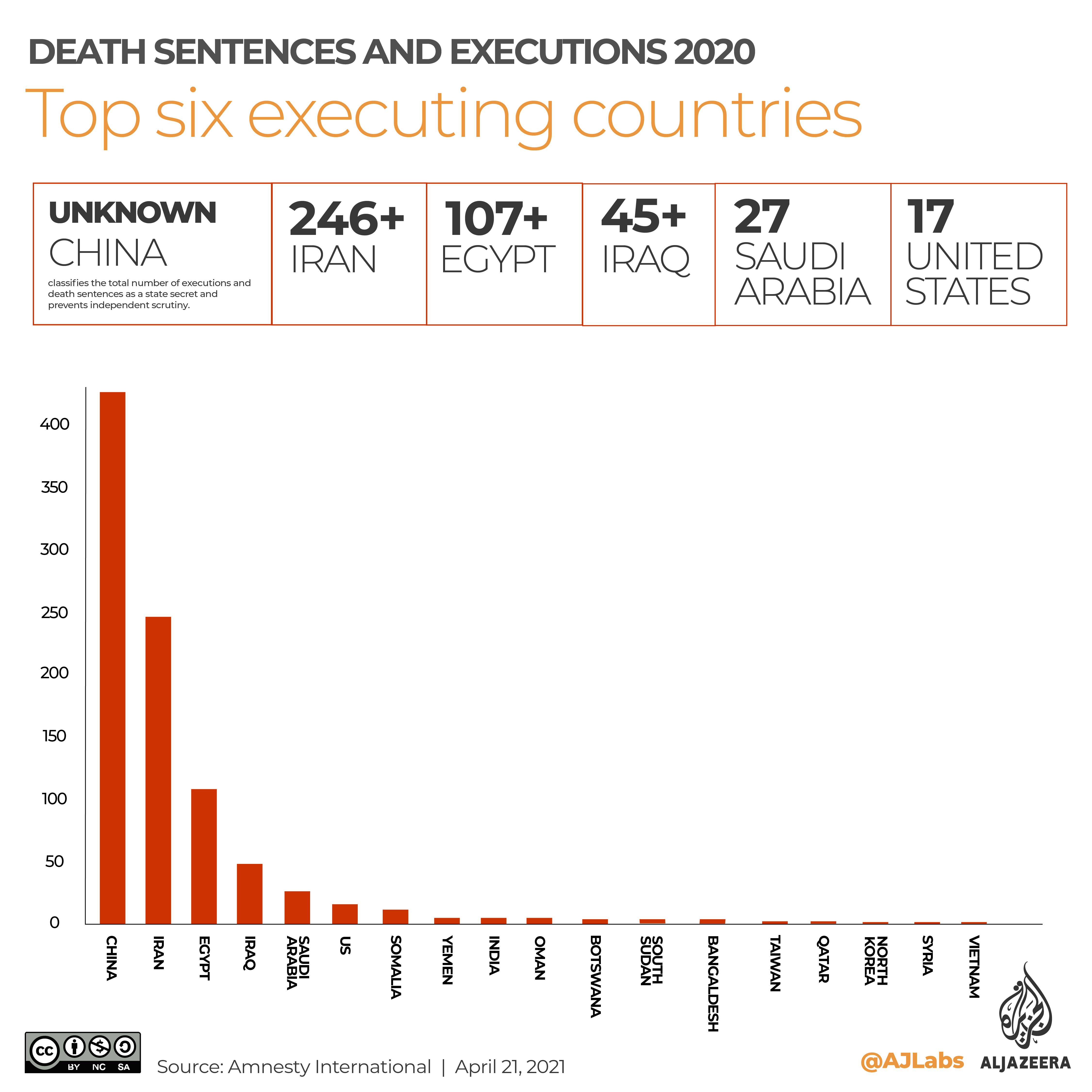 The total number of executions cited by Amnesty International does not include the thousands of people that Amnesty International believes were executed in China, where death penalty data is classified as a state secret.
