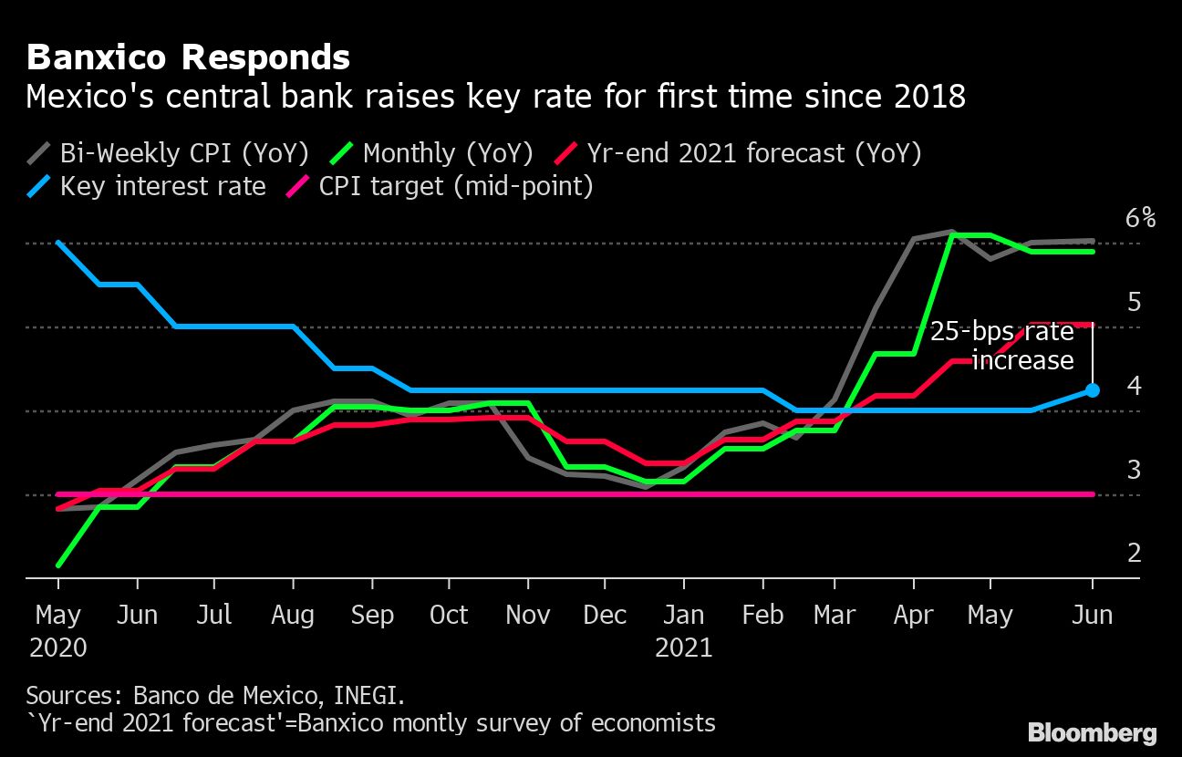 Banco de Mexico raised its key rate by a quarter-point to 4.25% in response to a jump in inflation that policy makers had previously described as transitory. The decision, supported by three of the five-member board, surprised all 23 economists surveyed by Bloomberg who had expected the bank to hold at 4%. Data published Thursday morning showed that inflation accelerated further in early June to 6.02%, also surprising analysts.