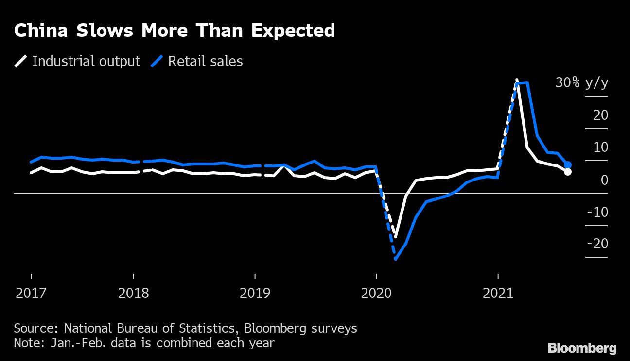Retail sales were hit by tough new virus restrictions introduced toward the end of the month to contain fresh outbreaks. Flooding in central China and weak auto sales due to a chip shortage hurt manufacturing, while a slowing property market and environmental policies reduced output of steel and cement, hitting commodity demand.