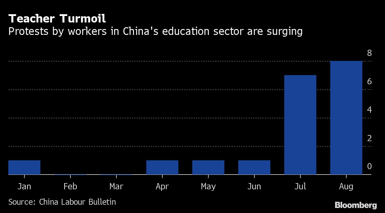 There have been eight protests involving workers in the nation’s education sector so far in August, the most in monthly data compiled by labor watchdog China Labour Bulletin going back to January 2019. There were another two incidents in late July in the days after the overhaul was announced.