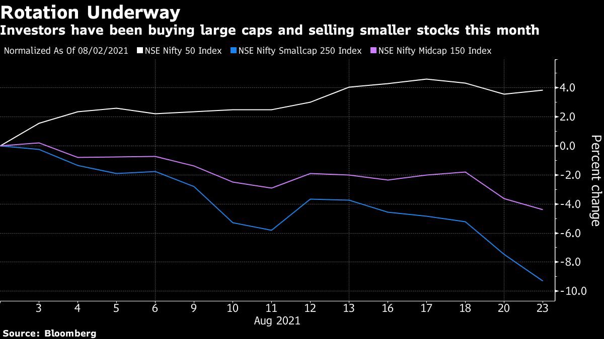 The NSE Nifty Smallcap 250 Index has plunged 8.6% so far in August, on course for the first monthly drop since October. The NSE Nifty Midcap 150 Index has lost 3.1%.