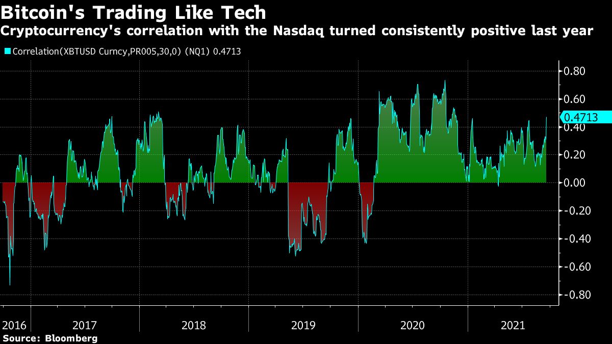 Although Bitcoin doesn’t always trade in tandem with financial markets — a characteristic that made it a tempting proposition from a portfolio-diversification point of view — its correlation on a 30-day basis to futures on the Nasdaq 100 has been consistently positive since February last year. A reading of 0.5 — which it’s close to now — means they’re moving in the same direction quite often these days.