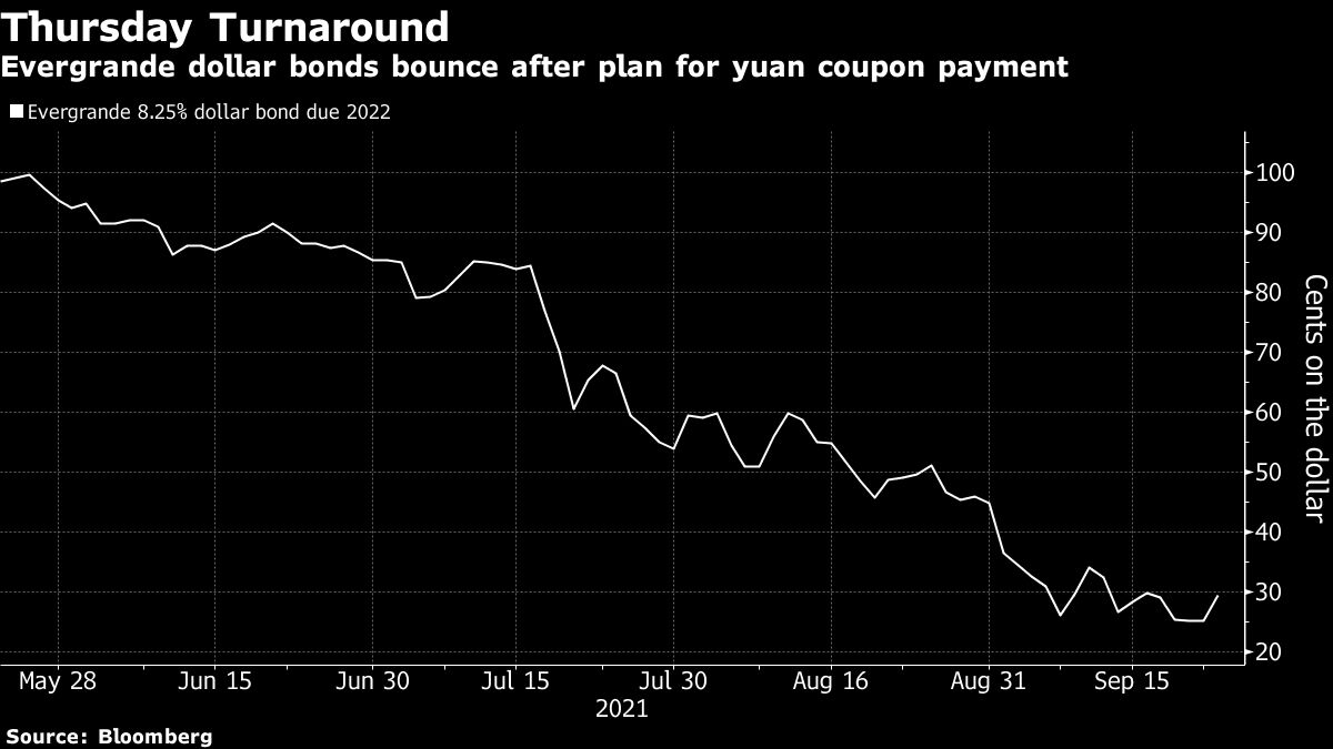 Speculation that Evergrande may avoid a worst-case scenario helped lift its bonds and stock on Thursday. The company’s 8.25% dollar note due 2022 climbed 4.8 cents on the dollar to 30 cents as of 5:39 p.m. local time, hitting session highs after Bloomberg reported regulators’ instructions to Evergrande. The bonds are still pricing in expectations of a deep haircut, but not quite as extreme as earlier this week. Shares jumped 18% in Hong Kong before the Bloomberg report, paring this year’s loss to 82%.