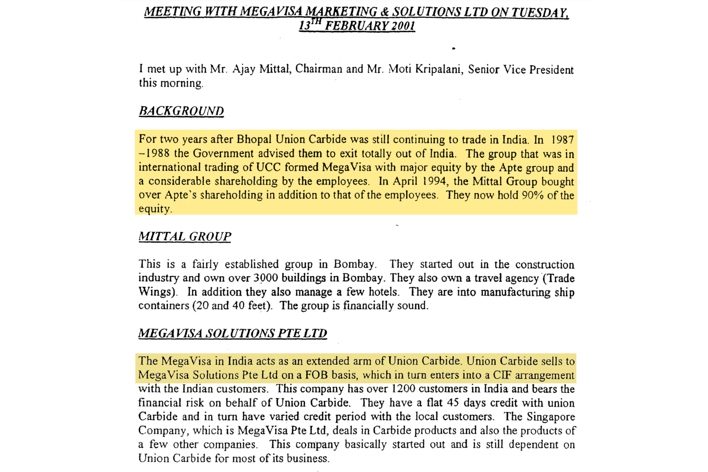 Mittal owned a firm in Houston, called Mega Global Services, which was set up in March 1993, documents show. A month later, Carbide Asia Pacific terminated its contract with Visa Petrochemicals and, on the same day, signed a new agreement with Mega Global.