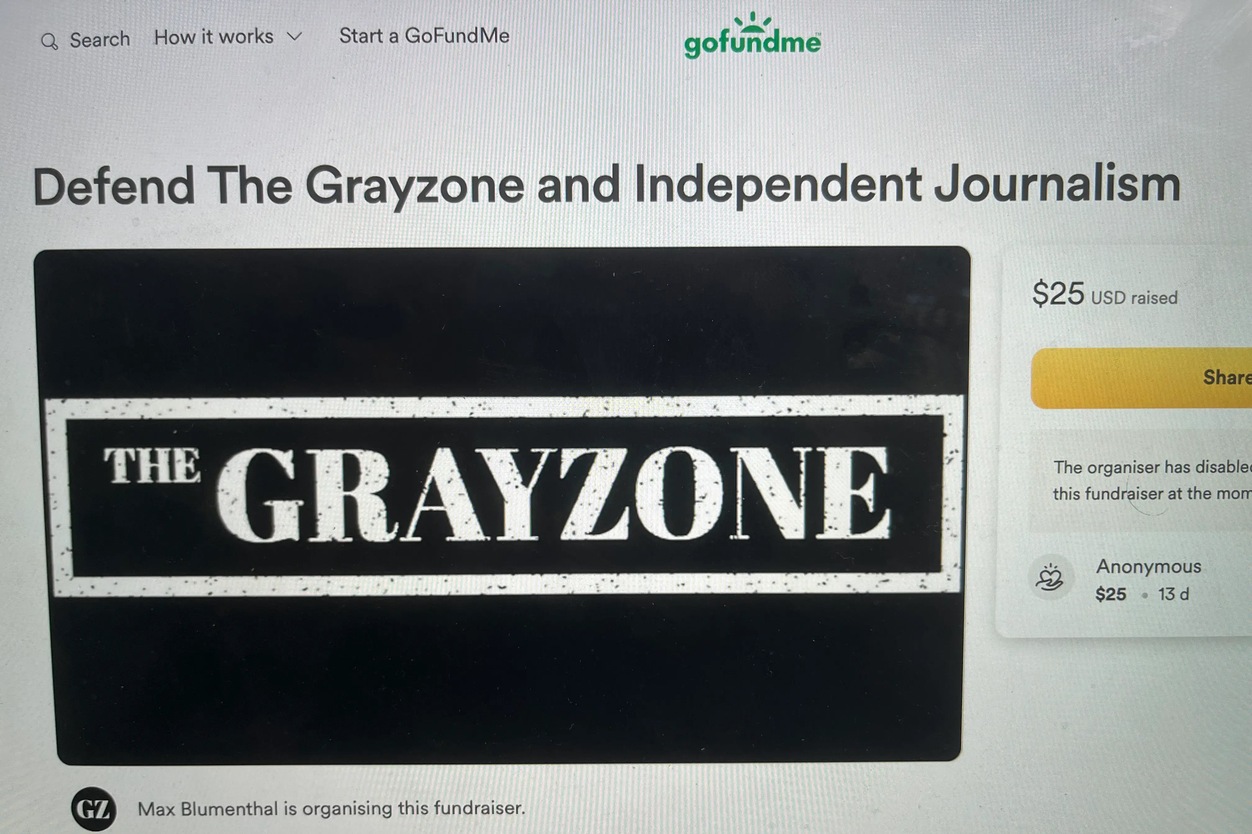 GoFundMe said that every fundraiser on its platform is subject to review and that The Grayzone was able to continue to solicit donations until it cancelled the fundraiser.