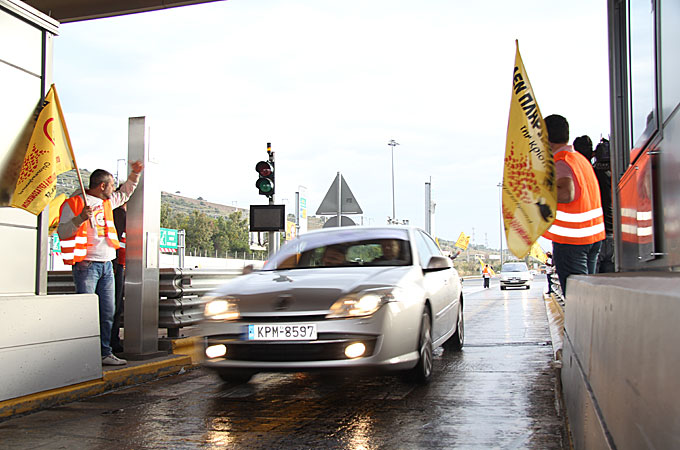 | Activists from the Den Plirono [‘Don’t Pay’] group swamp the toll booths, move the barriers and wave their bright yellow flags, allowing vehicles to pass through – saving each driver 3.05 euros on their journey [Al Jazeera] |