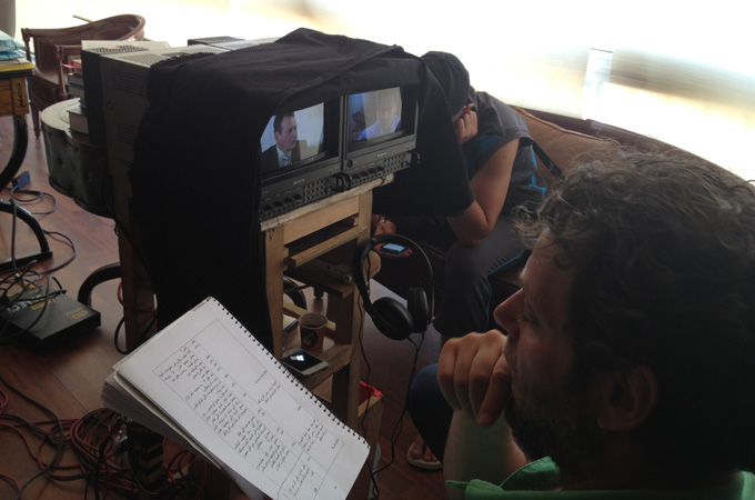“Work it into the role,” he tells the actor hurriedly from behind a monitor. “Your character is distraught.”