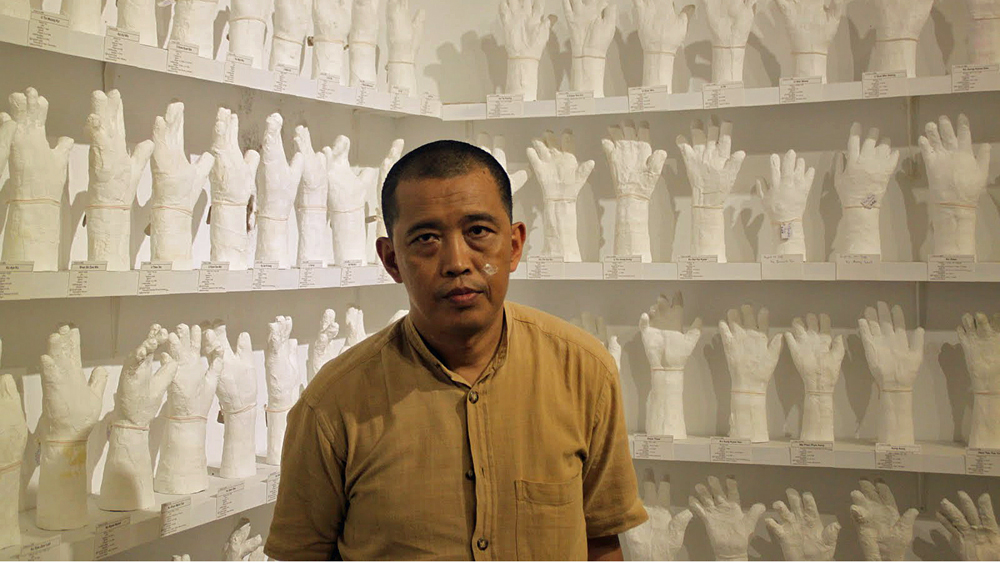 While creating a cast of one of their hands using plaster of Paris, Htein Lin talks with them about their experiences behind bars, and the process is filmed or photographed for his multimedia piece.