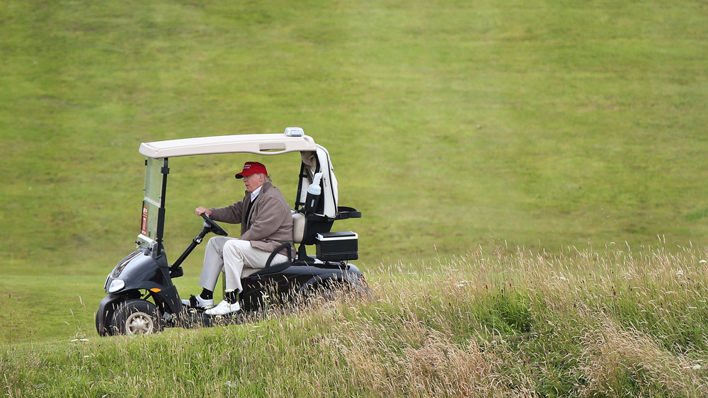 Presidential contender Donald Trump drives his golf buggy on the Turnberry golf course in Ayrshire, Scotland [Scott Heppell/AP]