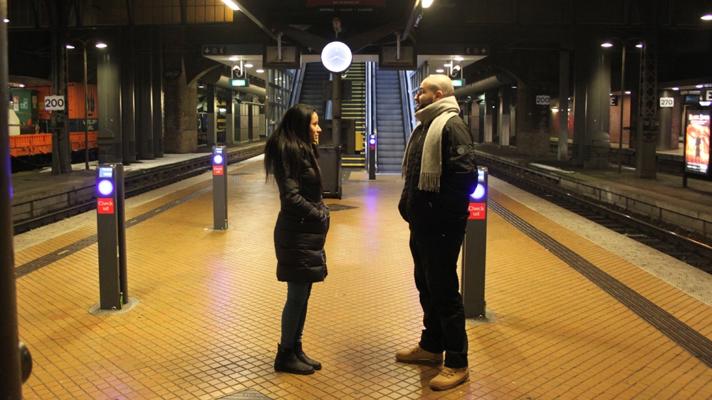 As the train arrives, Abdel Razak and Walid focus on the faces behind the glass. The doors open and people disembark onto the platform. The two split up so that they can walk from door to door and scan the crowd.