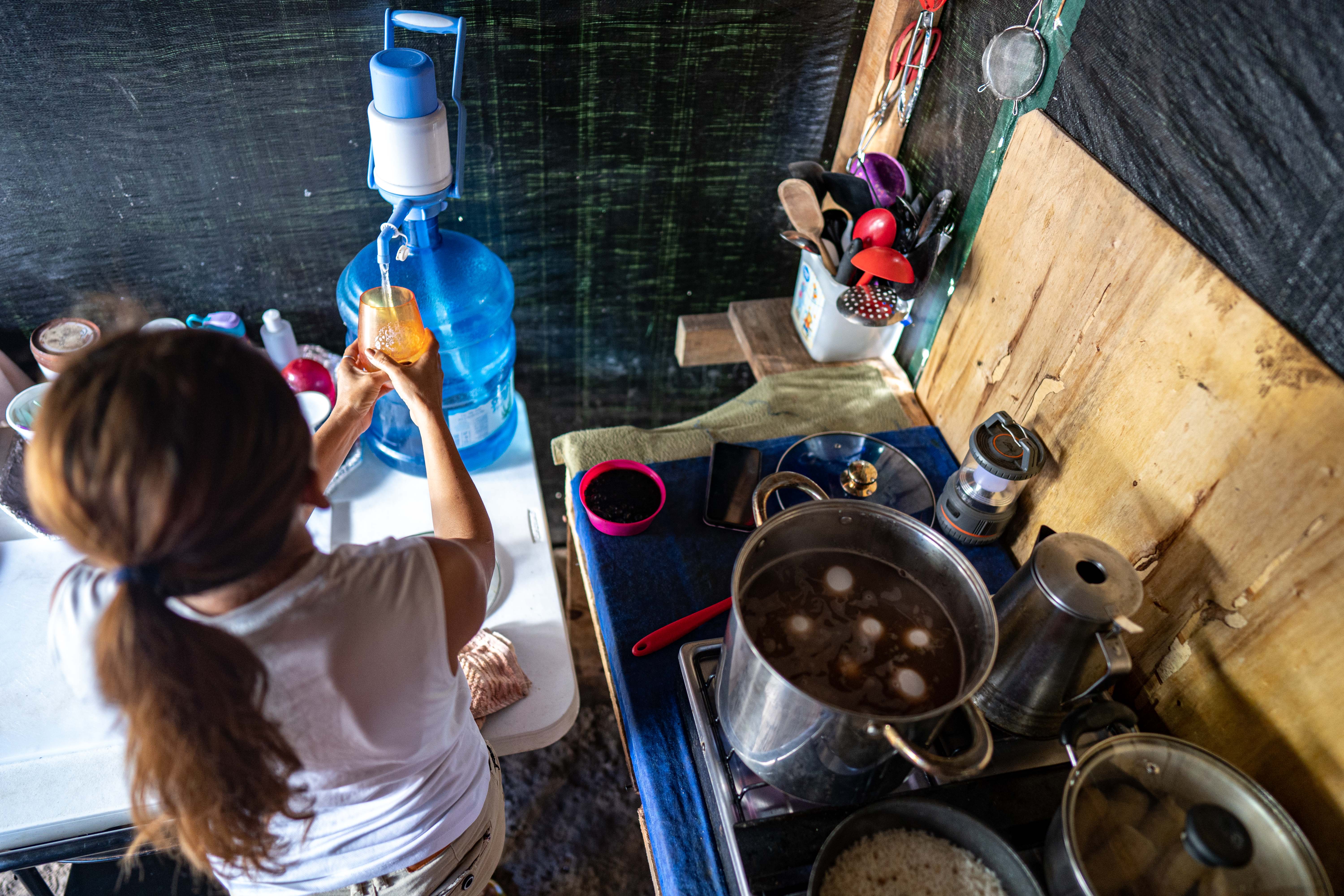 Yami has a quiet voice that matches her small frame but not the substance of her words. She talks quickly while moving around the little wooden structure with tarpaulin walls and a mud floor that serves as the communal kitchen for the tents in Yami’s area. An assortment of pots, utensils and kitchen spices are neatly arranged on shelves.