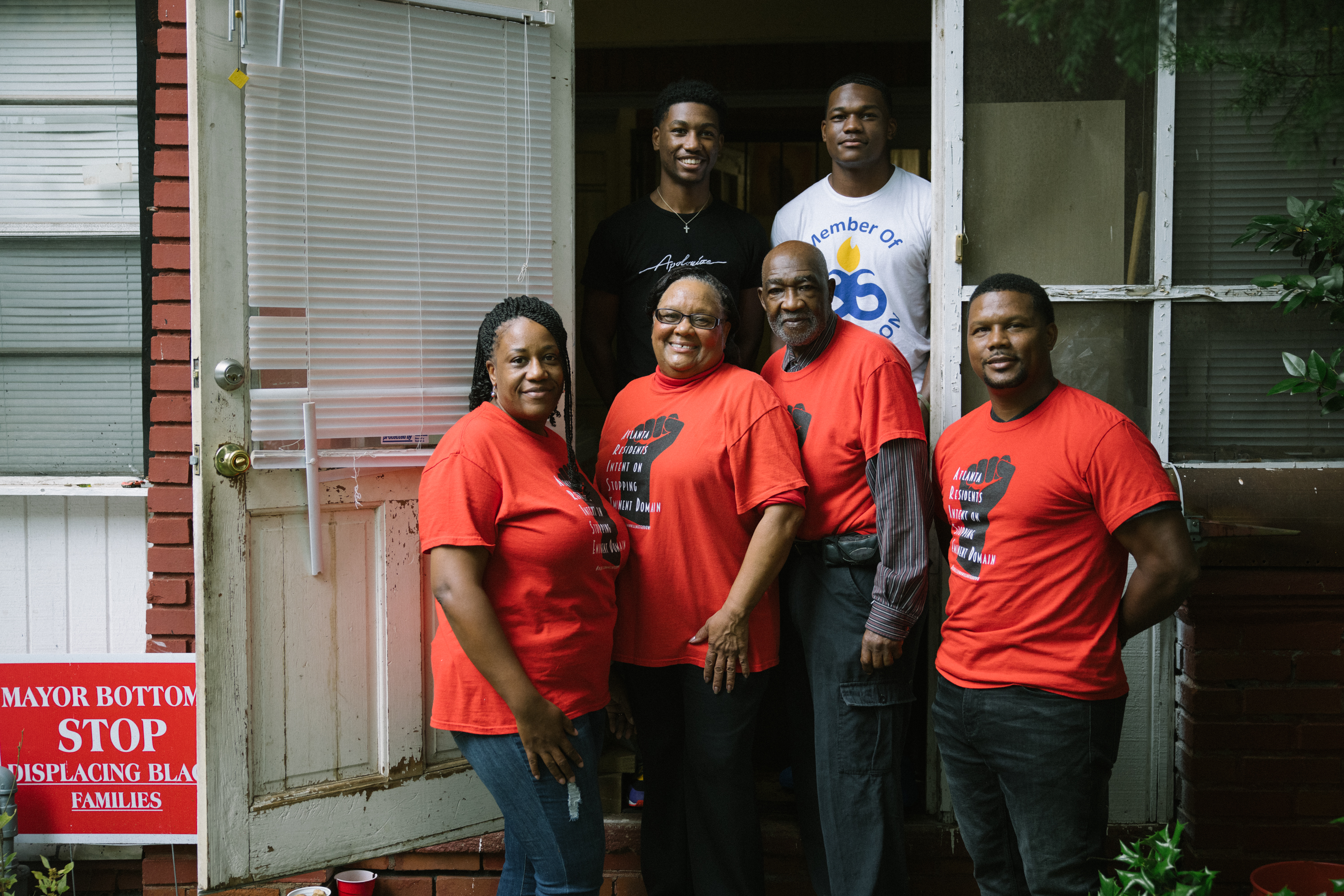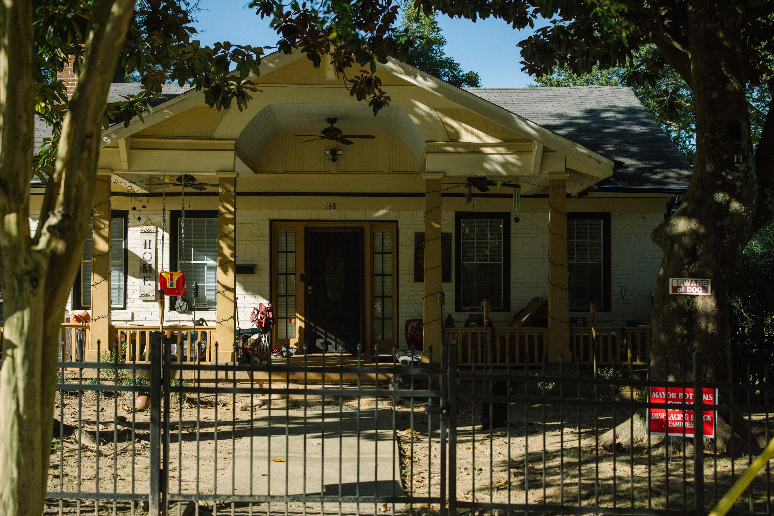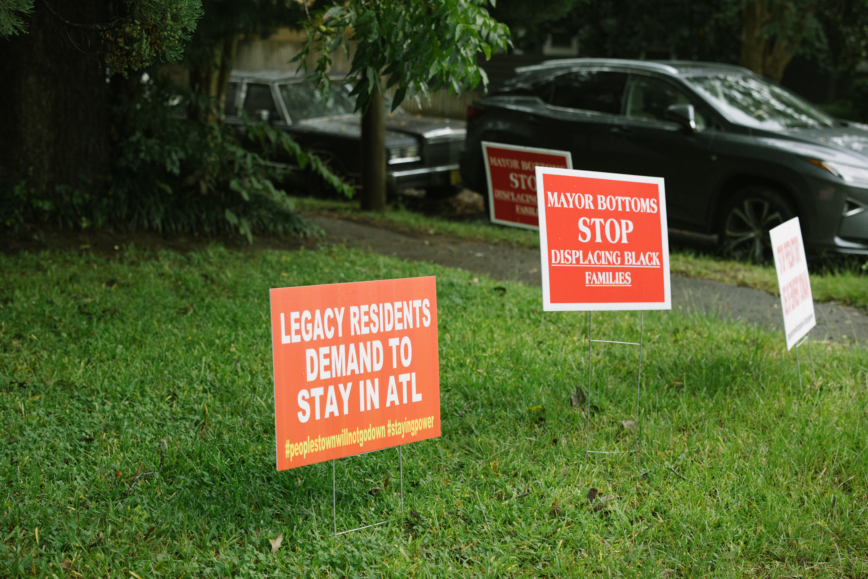 “Mayor Bottoms, stop displacing Black families,” one of the signs reads, referring to Atlanta’s current mayor, Keisha Lance Bottoms. “Stop predatory use of eminent domain,” is printed onto another.