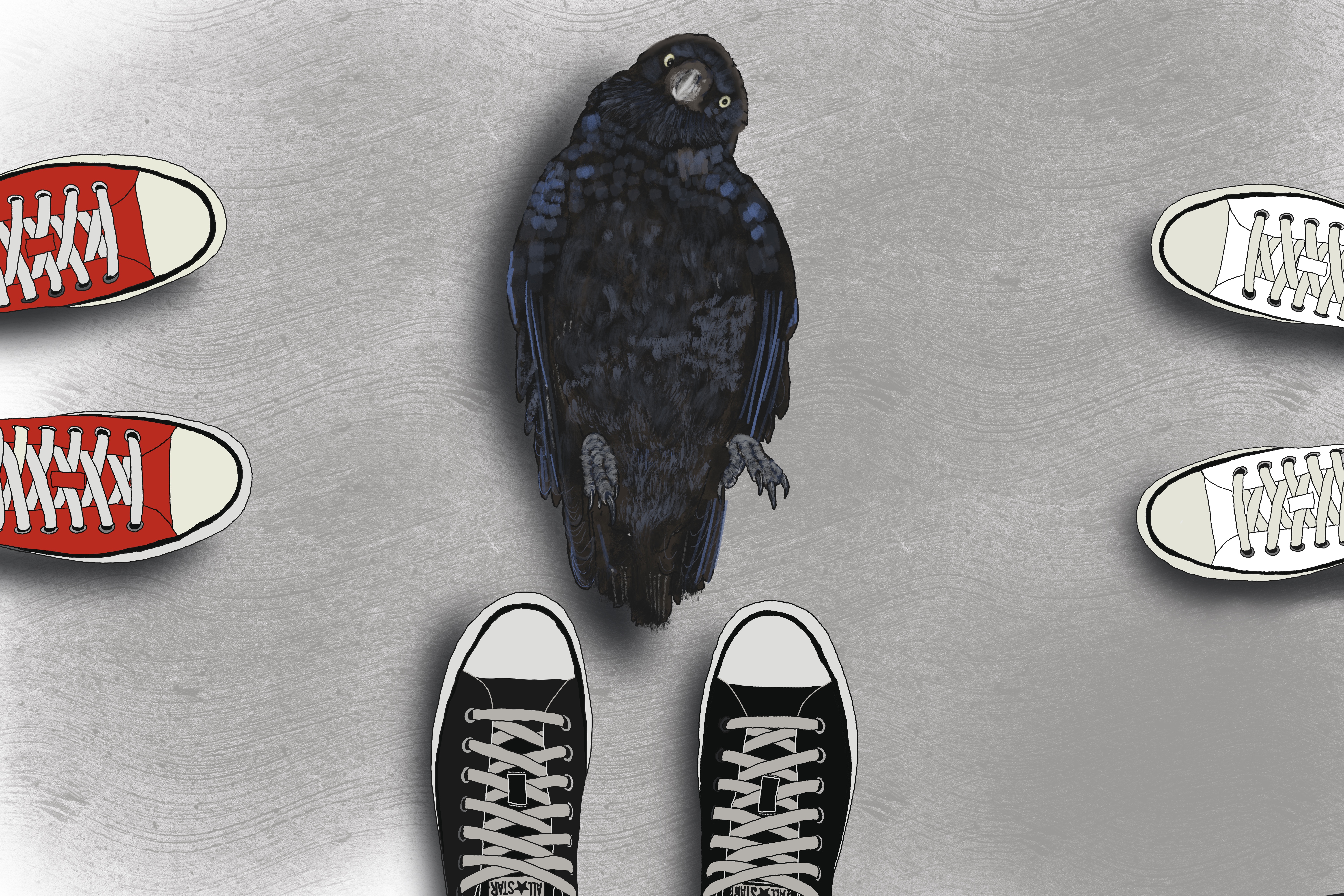 I put my shoes on and followed my kids across the street. The crow was on the pavement against the curb. It lay on its back, blinking up at us. We stared back. Alex and Talia were in tears. “Mama, can’t we help it?!”