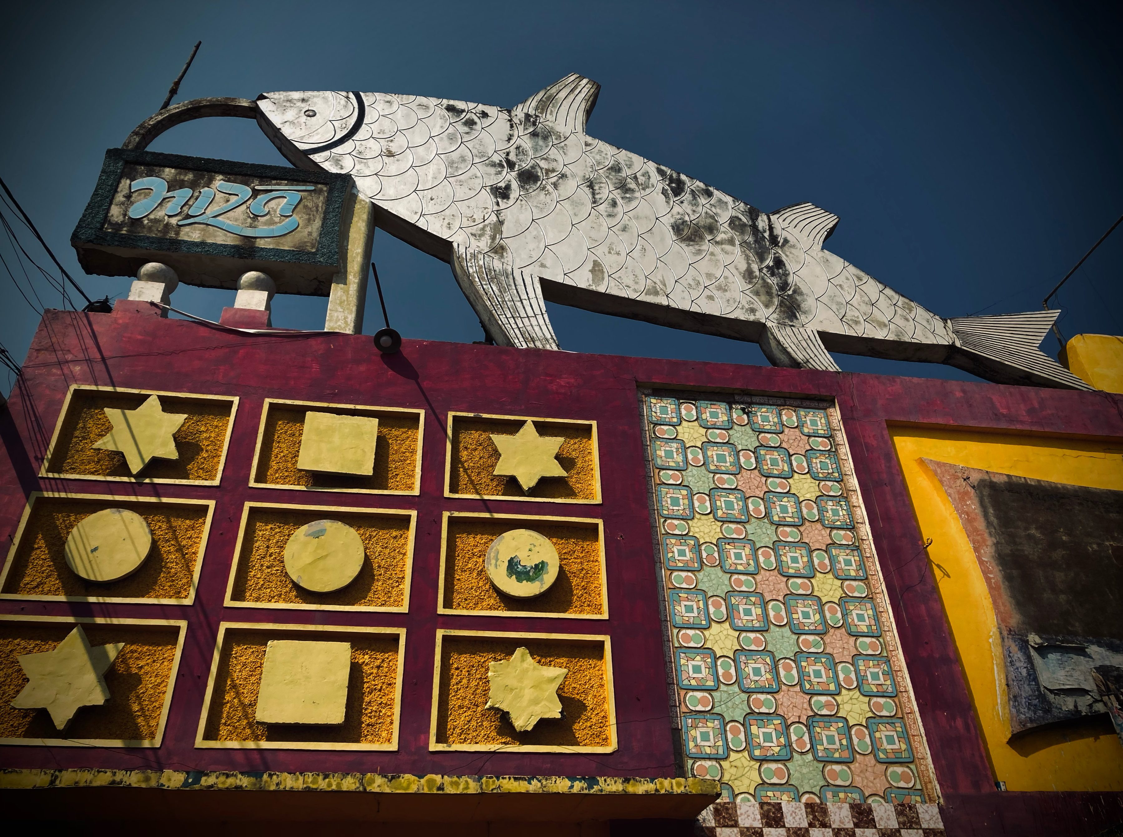 His photos capture this diversity in remarkable detail. From a literal hole-in-the-wall ticket window at a cinema in Jaipur to an ornate sculpted window at Roxy Talkies in Agra, designed to match seamlessly with the window of the adjoining mazaar (shrine). A ceiling with bold circles, lines and scalloped edges rimmed in light at Patiala’s Phul Theatre contrasts with the weathered exterior of an abandoned cinema in Sawai Madhopur, its past as a railway yard evident in the arched gates through which broad- and narrow-gauge tracks would pass. And a sweeping staircase is flanked by a bannister carved with music notes in a Delhi cinema, while an apsara (celestial dancer) looks out over the dust-laden grand lobby of a theatre in Pune.