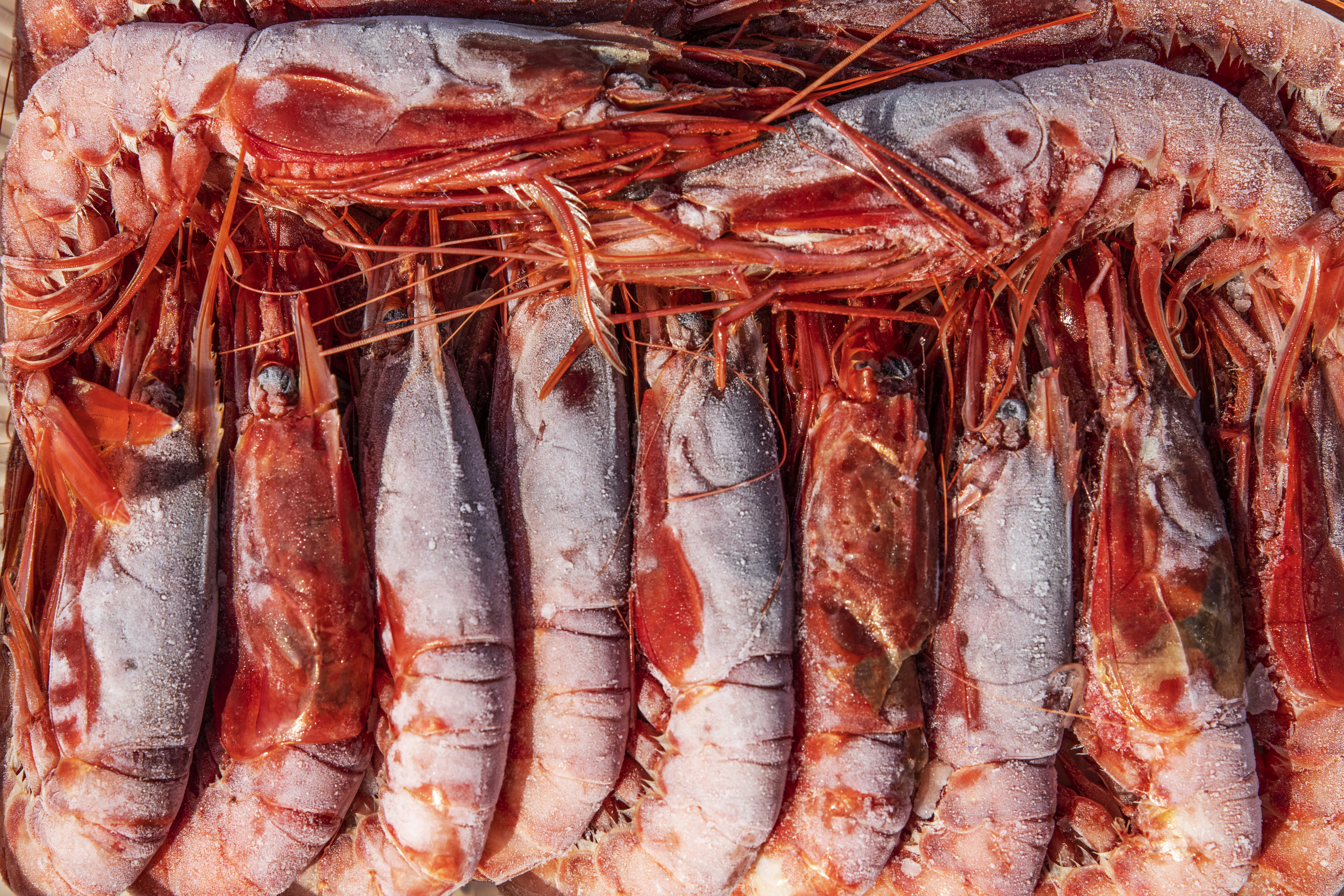 “Look! Red like the blood it takes our men to bring them here,” says Nicola Boccellato, as he lays out red prawns – 1kg for 50 euros (about $60) – on one of his stalls.