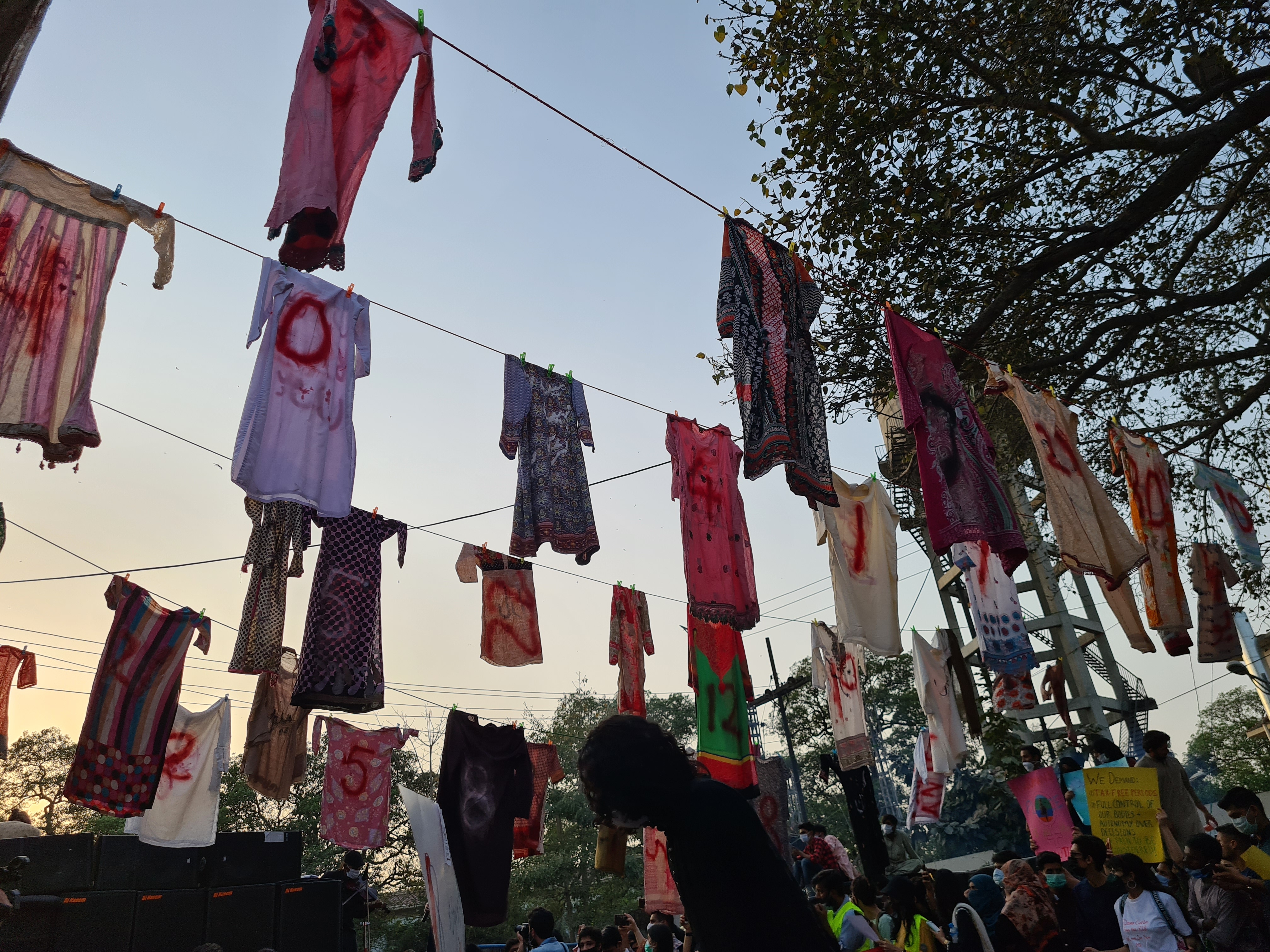 At Aurat March Lahore, organisers decorated the road with an installation, titled “Stains of Patriarchy”.