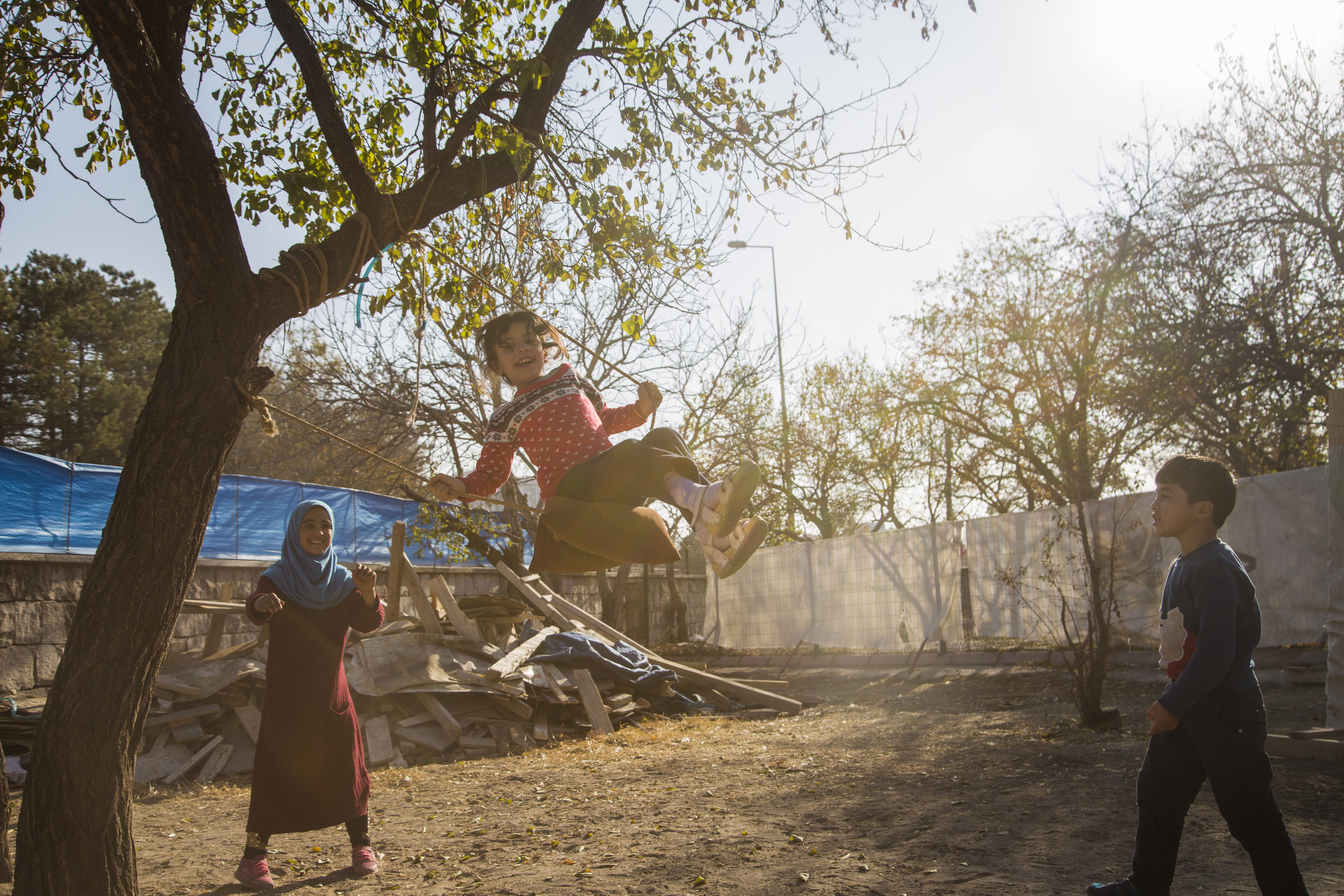 Close by, outside the home of another Syrian family, three young girls are playing with a Uighur boy on a makeshift swing attached to a tree.