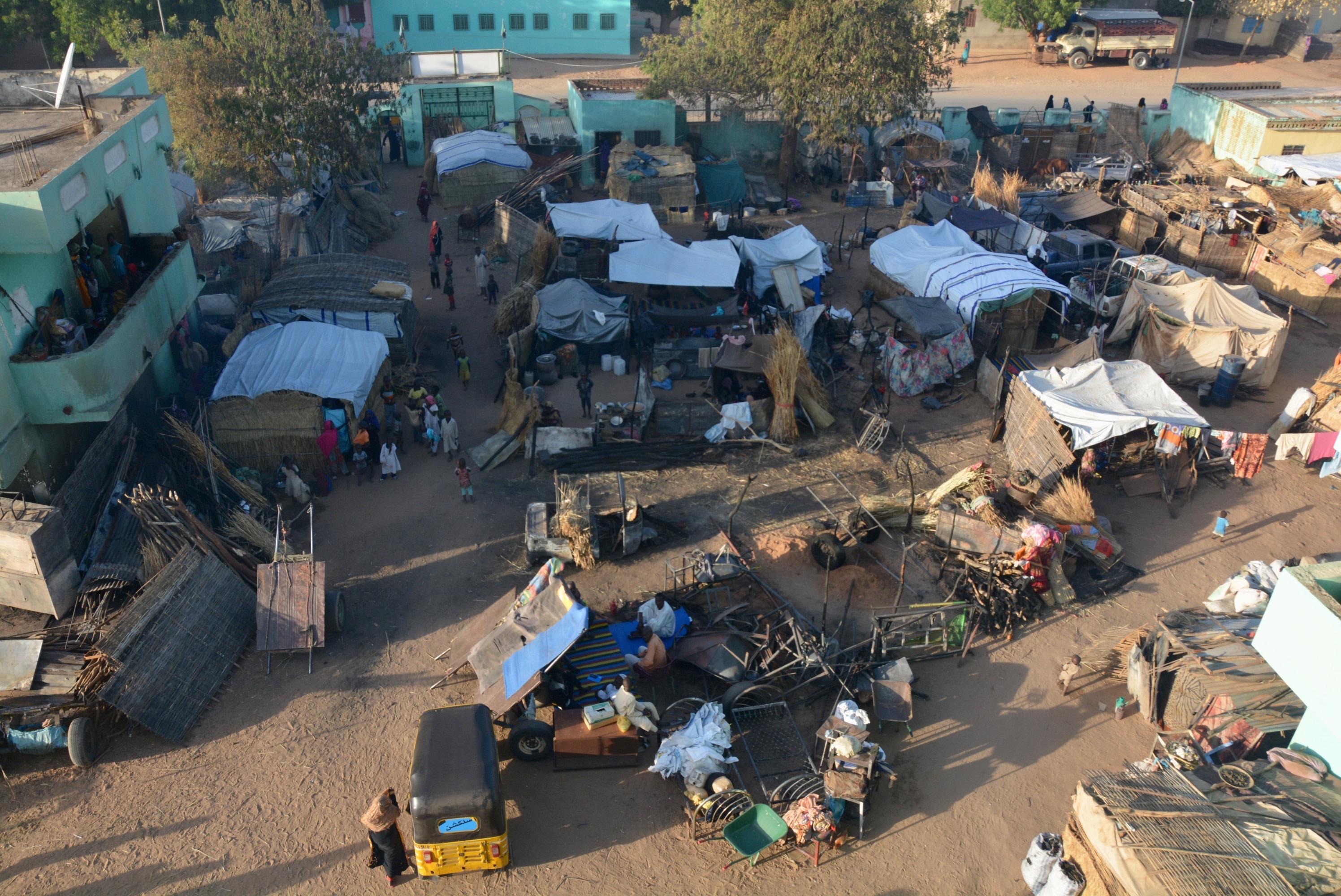 In the last 18 years of war, Darfur IDPs have become seasoned in the art of building shelters – made of cardboard packaging, plastic sheeting, branches, straw, and occasionally even bricks. Since January’s flood of new arrivals, huts in El Geneina have been built in record time: An empty sandy square in the morning could turn into a new crowded camp by twilight. Meanwhile, some people squat on the stairs of buildings, on balconies, or in abandoned cars within compounds. Inside the “gathering sites”, horses, donkeys, goats, sheep, chickens – everything that could be saved while fleeing the camp – have found a home.