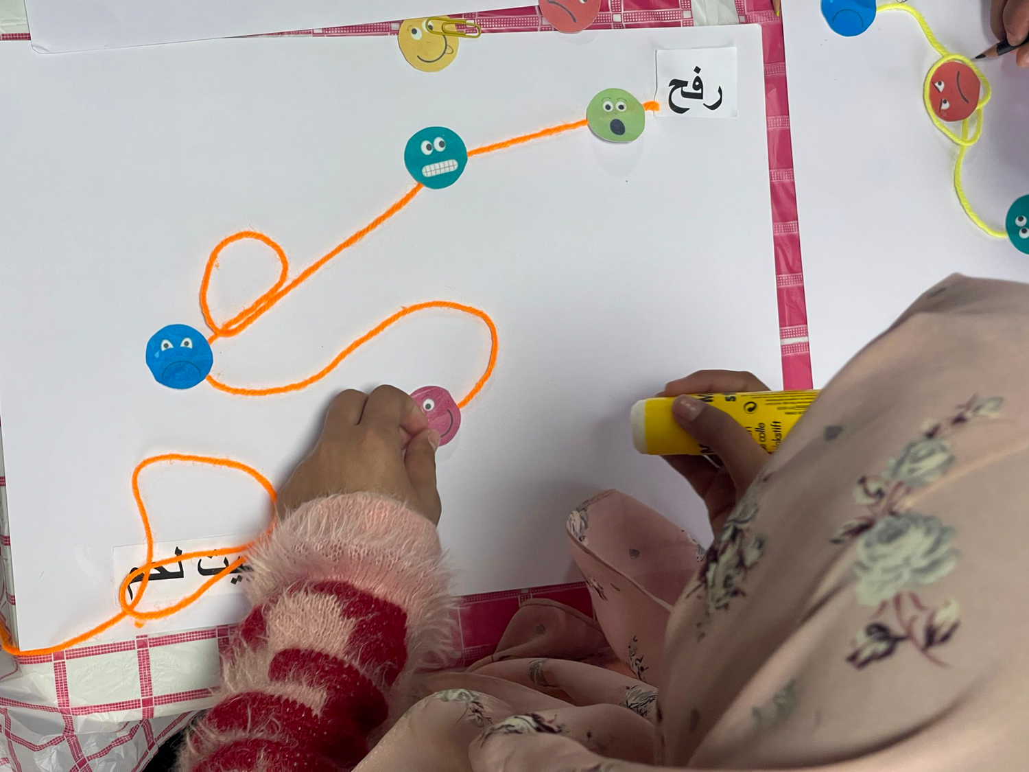 One girl was focused on cutting out the word “Rafah” and glueing it to a corner of her sheet with a sad, scared, frowning face glued sideways next to it.