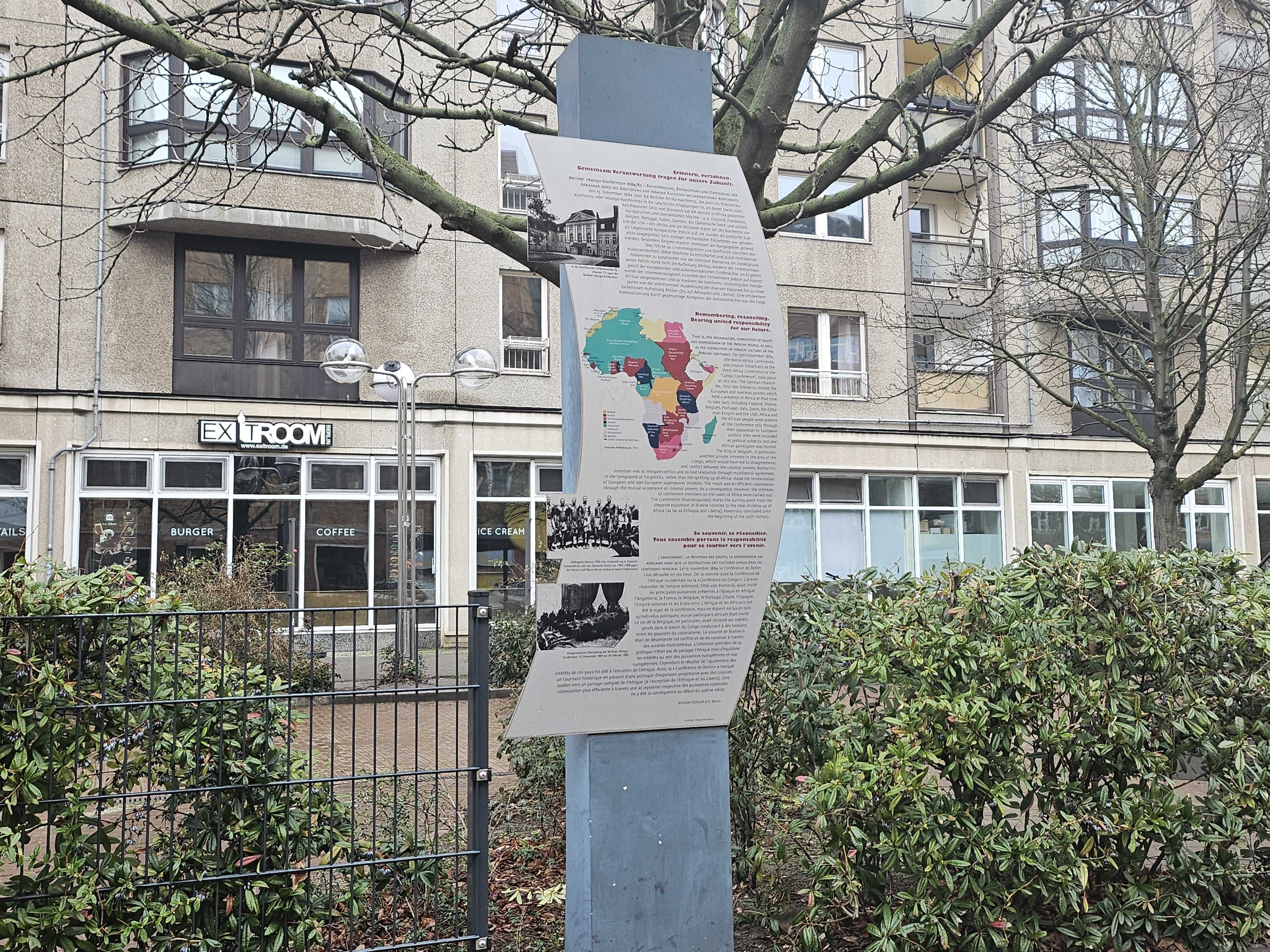 Unlike those beside it – official square plaques that tell of Germany’s Nazi history in sombre colours – this one is set awkwardly in front of a tree and bears an old map of Africa in vibrant hues of red and blue. That’s because it’s fairly new – put up just three years ago by the nonprofit Afrika Forum instead of the city of Berlin.