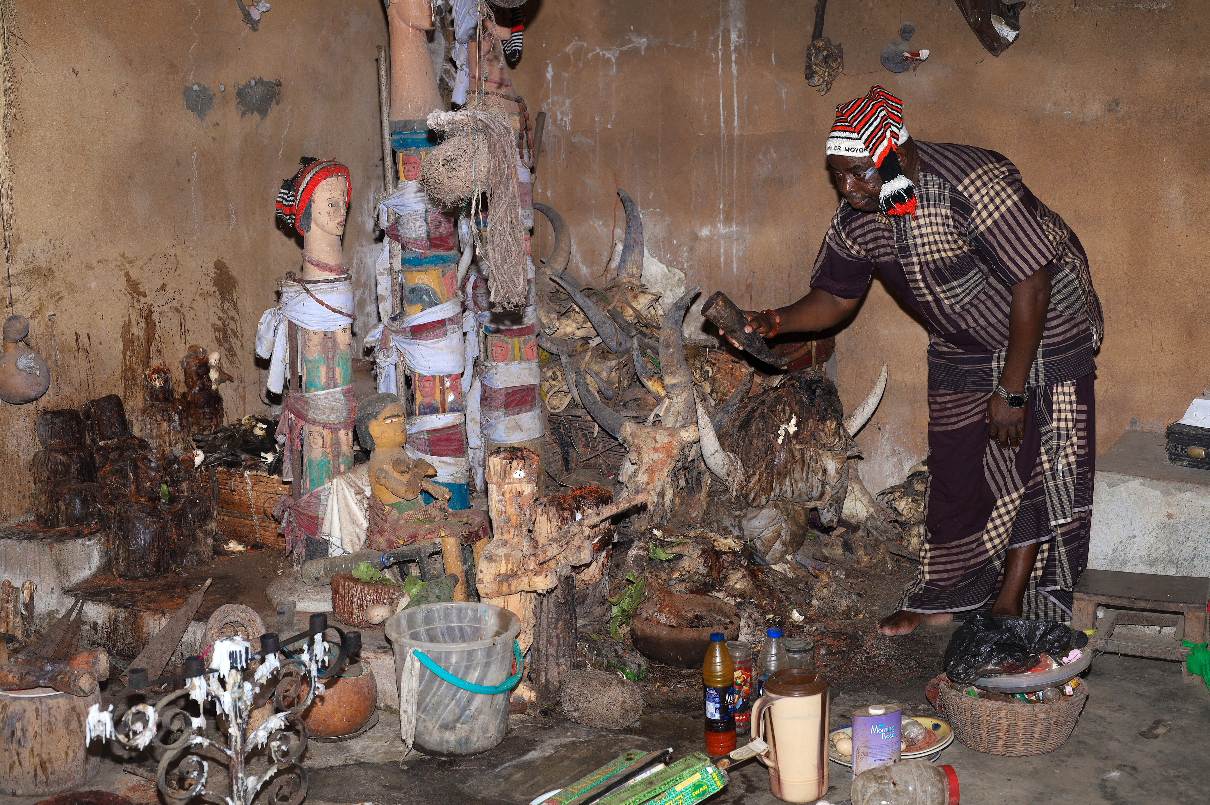 With his index finger, he marked the outer sides of his eyes with a white kaolin before gulping a mouthful of gin from a bottle. Then, with a pinch of kola nut between his fingers, he moved slowly between the various figurines of his oracles, decorated in animal blood.