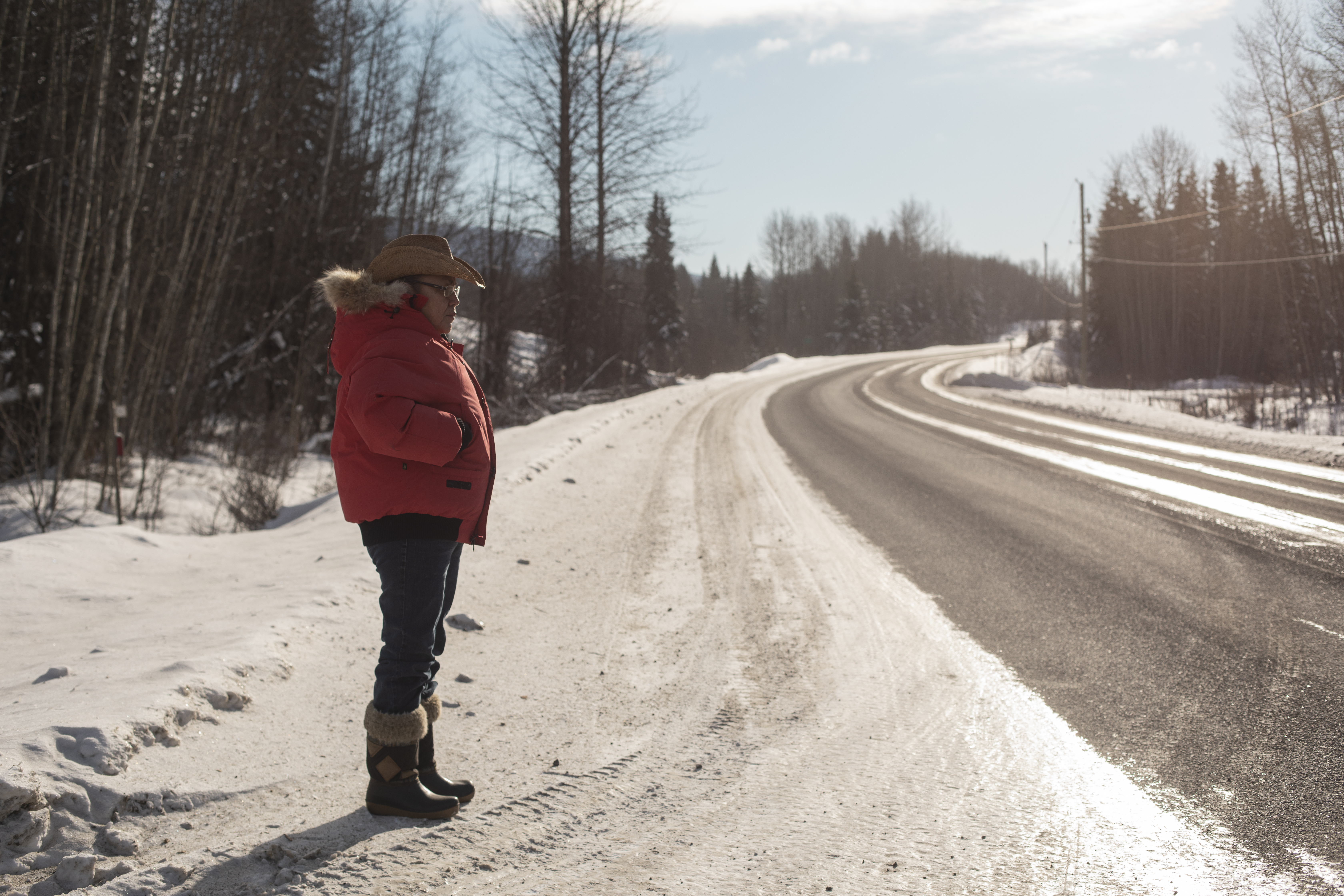 It is easy to hitch a ride, Marian says. To prove her point, she walks over to the shoulder of Highway 16 and sticks out her thumb. It is a bleak, haunting place, surrounded by wilderness. Every few minutes, a truck or passenger vehicle passes by. Within five minutes, a grey-haired white man in a farm truck has stopped to offer her a ride. When she explains that she doesn’t actually need one, the man shakes his head, hits the gas hard and drives off. “It’s that easy,” she says with a shrug.