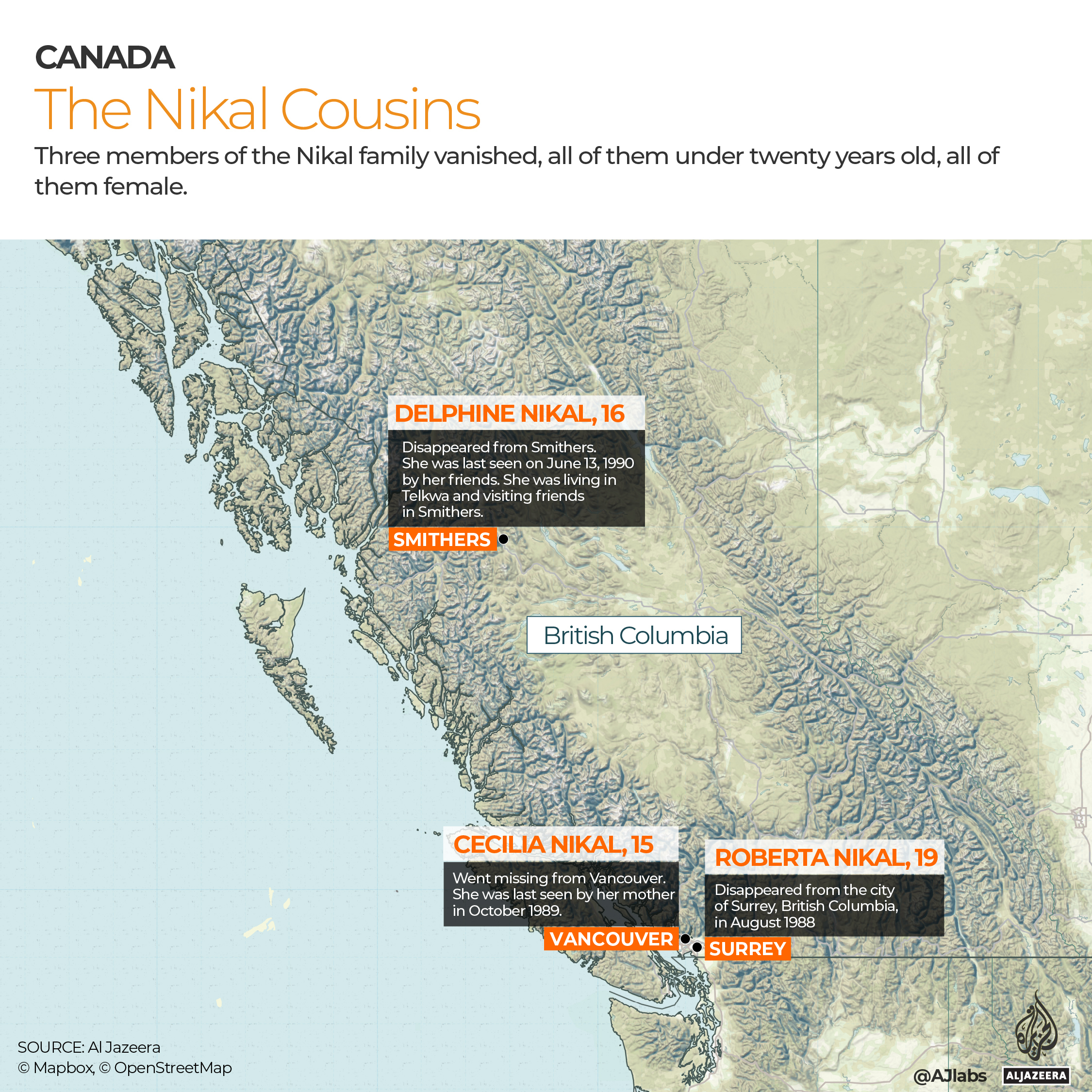 Less than a year before Delphine disappeared, her 15-year-old cousin Cecilia Nikal went missing from Vancouver. A year before that, in 1988, another cousin, 19-year-old Roberta Nikal, disappeared near the city of Surrey in British Columbia.