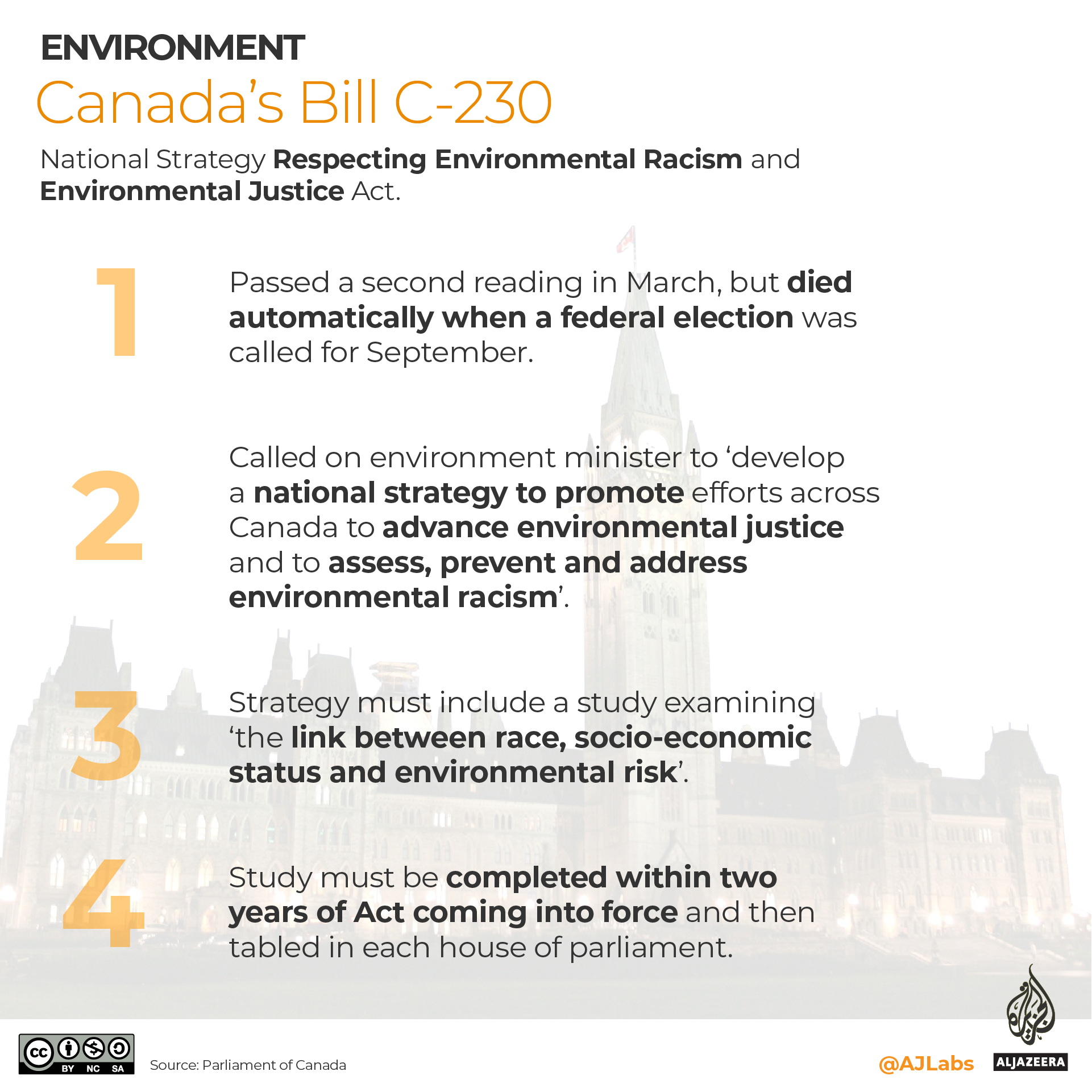 In an email, a spokesman for Canada’s federal minister of environment and climate change said Ottawa was committed to advancing legislation “to assist in addressing environmental justice issues” as part of the Canadian Environmental Protection Act. Gabriel Brunet told Al Jazeera that a proposed law - separate from Bill C-230 - would include “biomonitoring surveys”, which could involve probing the effects of pollution on vulnerable populations. The legislation would also facilitate “the making of geographically targeted regulations that could, for example, be used to help address pollution ‘hot spots’ that may disproportionately affect marginalized communities”, Brunet said.