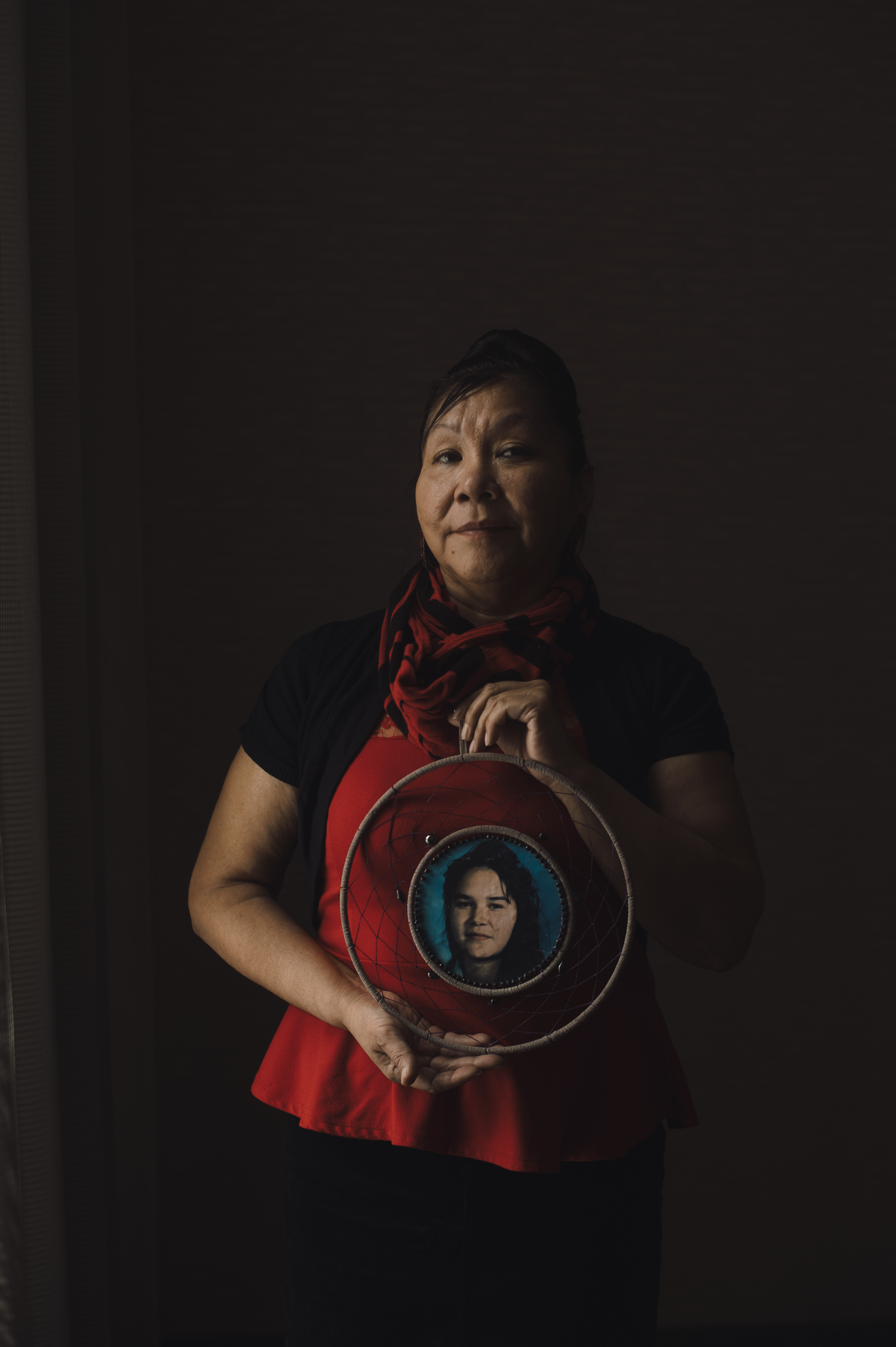 Brenda is dressed from head to toe in red, a colour that represents MMIWG, and wears a black mask with a red handprint. She has brought several framed photos of her sister to the local hotel where we are meeting. They show a fair-skinned young girl with dark, almond-shaped eyes, high cheekbones and long black hair.