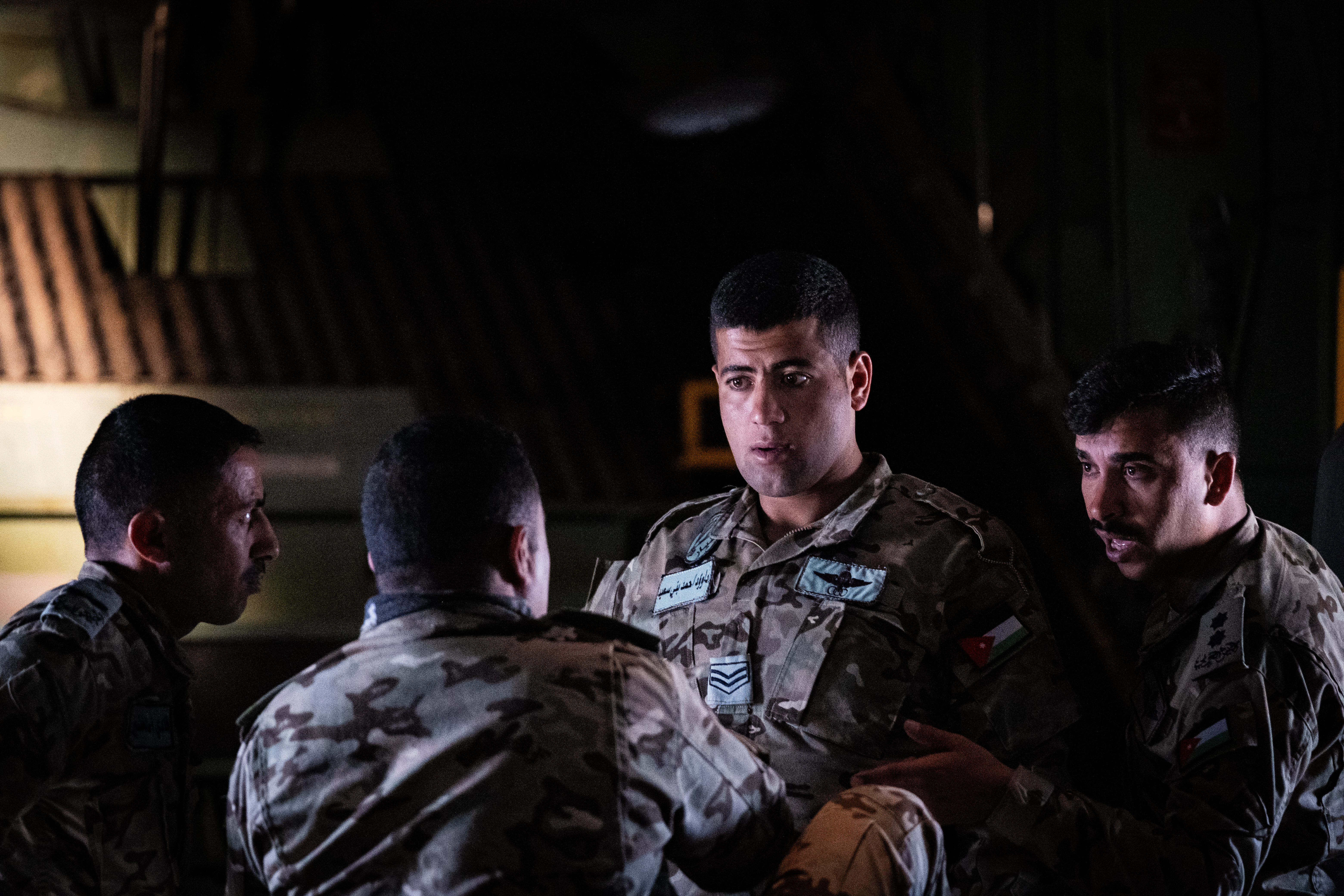 The special forces personnel remove their harnesses and huddle to discuss how the mission went. Every other word is inaudible to the rest of the crew as the plane rattles through the air.
