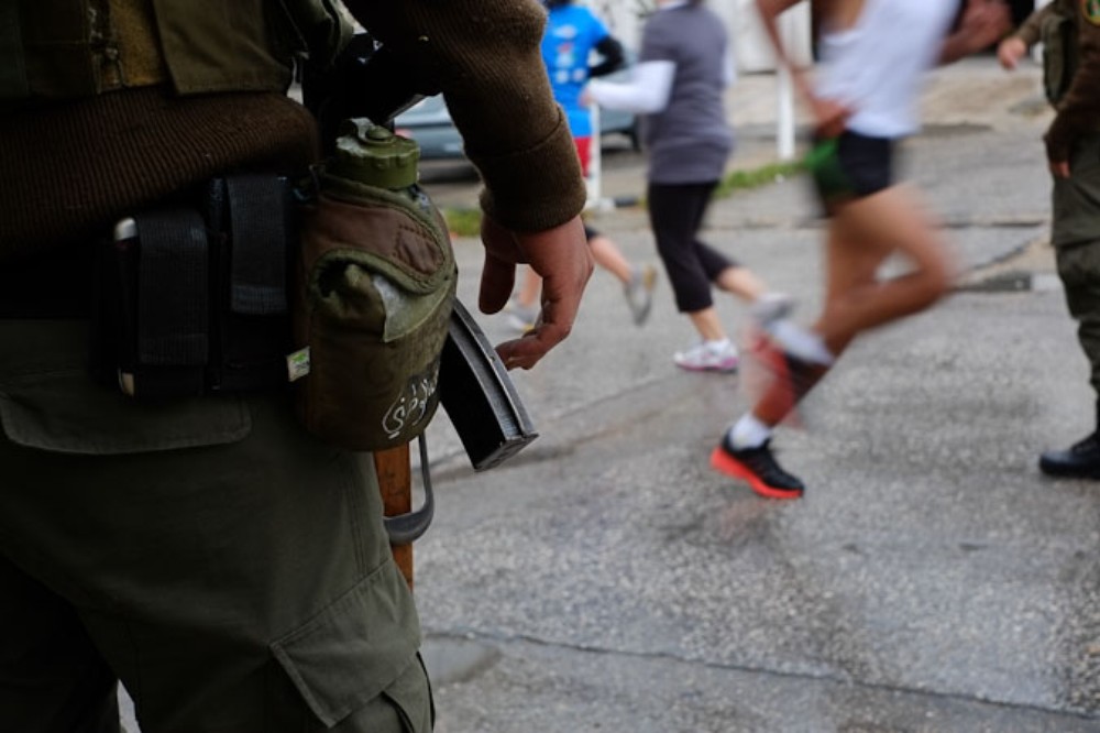 Some young Palestinian runners turned to the Israeli guard tower and made obscene gestures as they passed, highlighting the deep tensions that exist in the area.