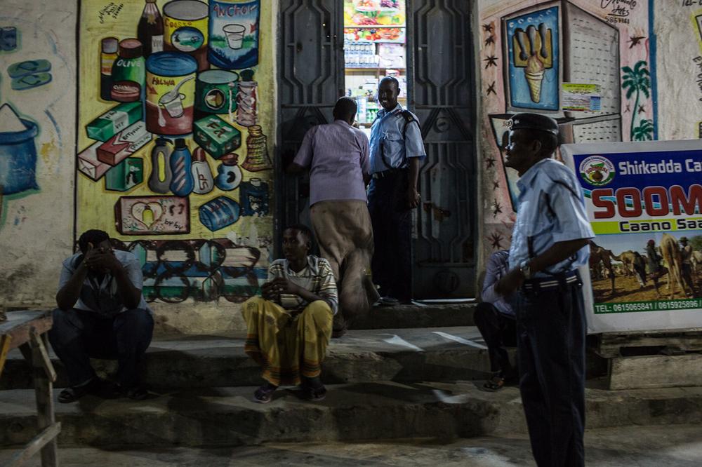 At one point during the patrol, vehicles passed freely through checkpoints as local police sat around chatting and sleeping, some chewing the stimulant khat while on duty. “It’s cold at night and we have to stay awake,” said one Somali police officer. “I chew khat to stay warm while we’re working.”